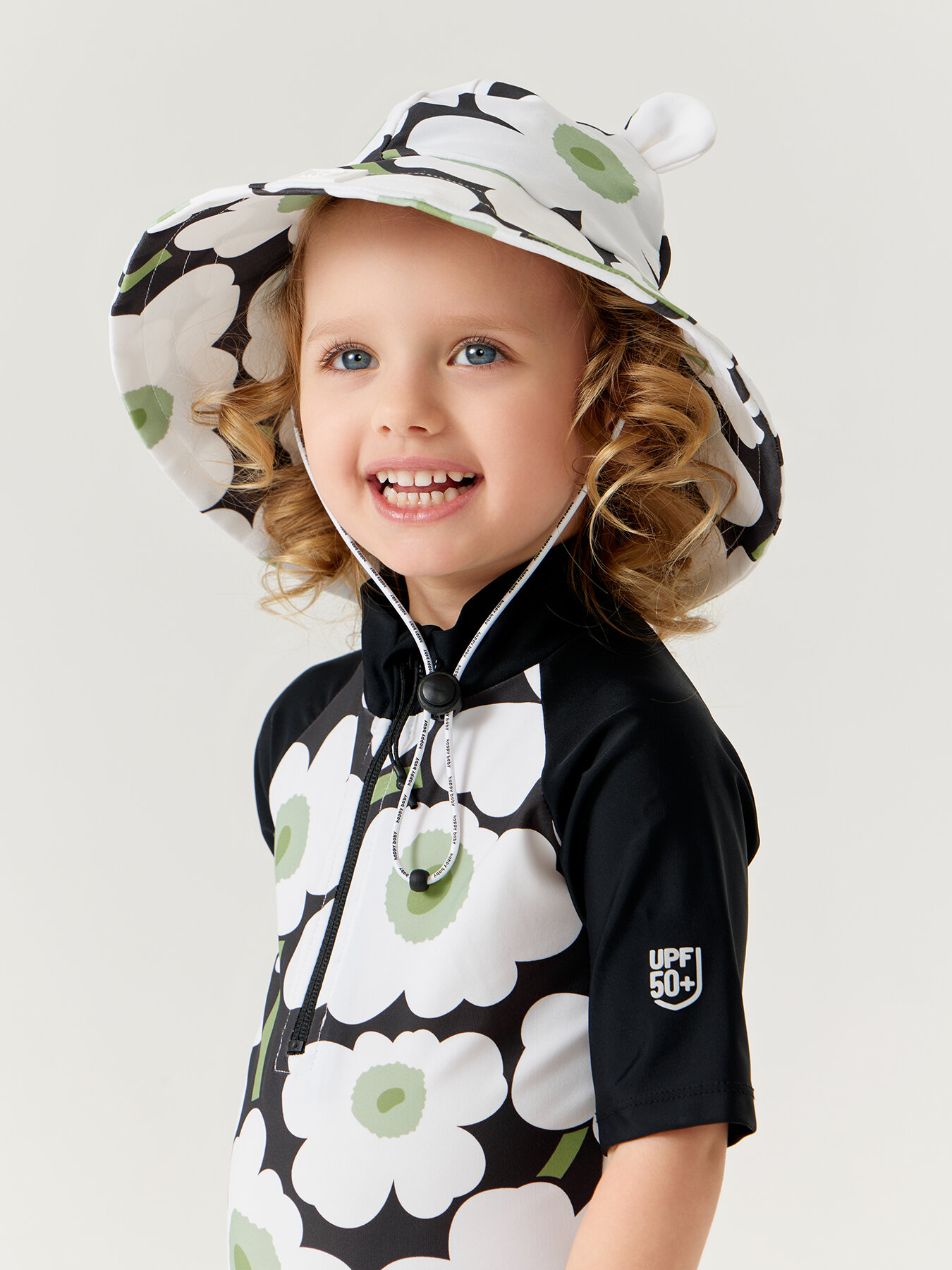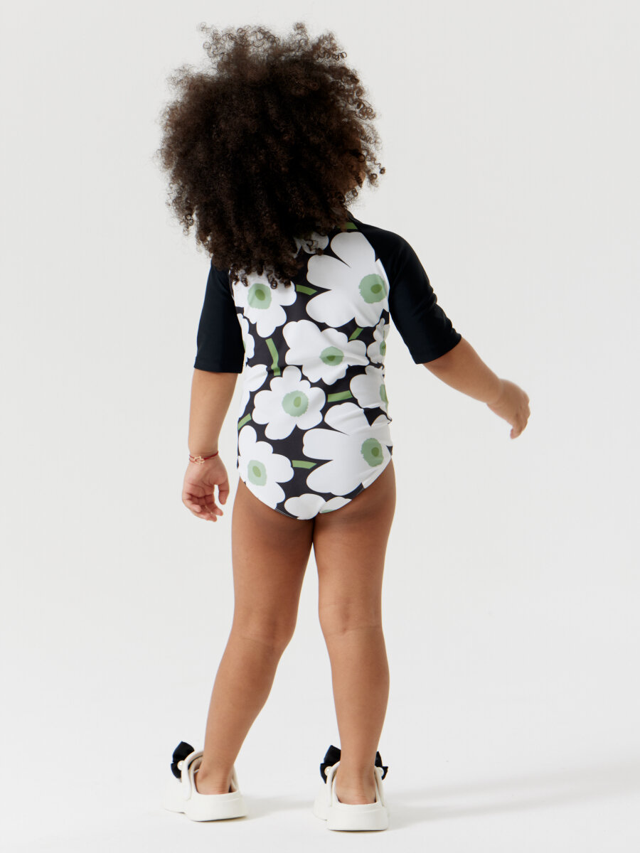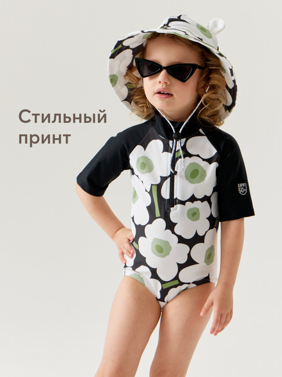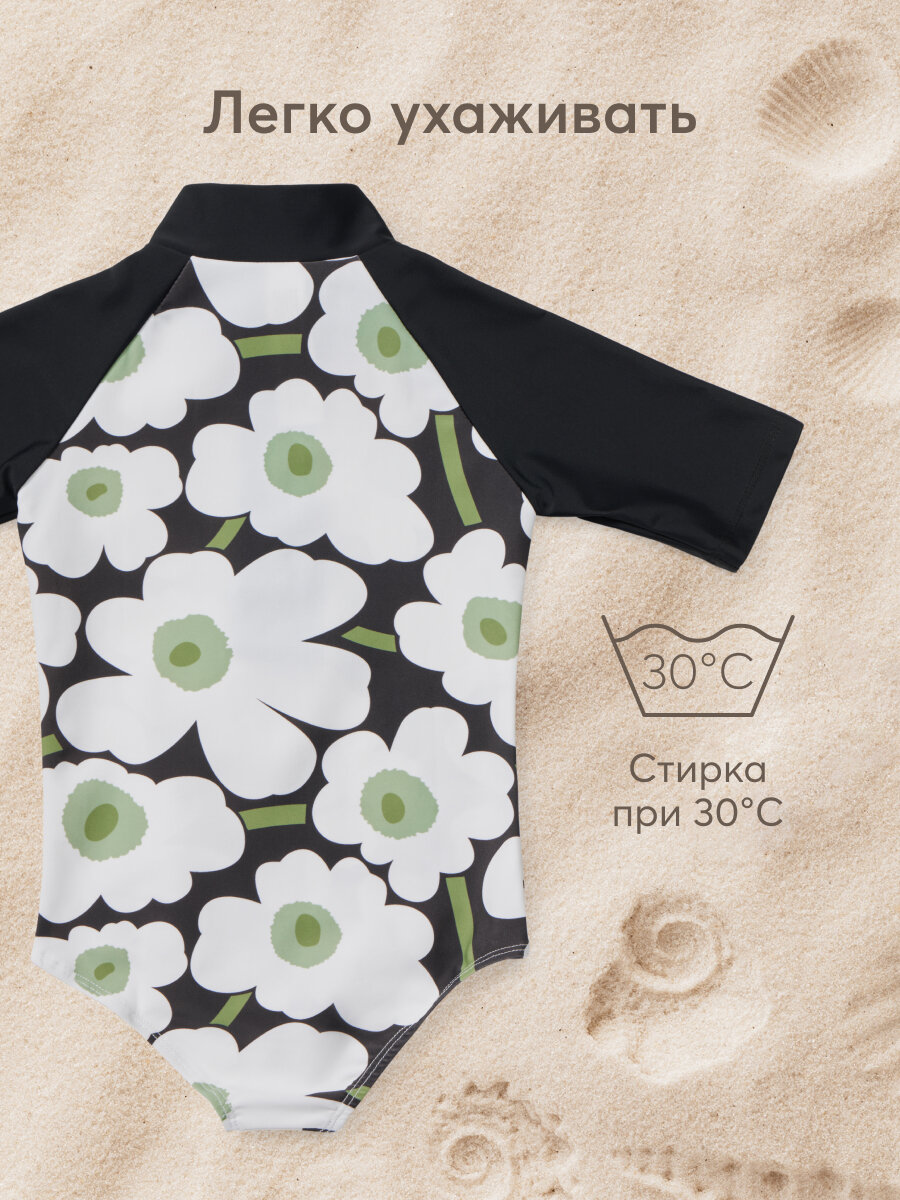 50657, Купальник слитный детский для девочек, защита от солнца UPF 50+ Happy Baby с длинным рукавом, на молнии, солнцезащита, черная с цветами, 104-110