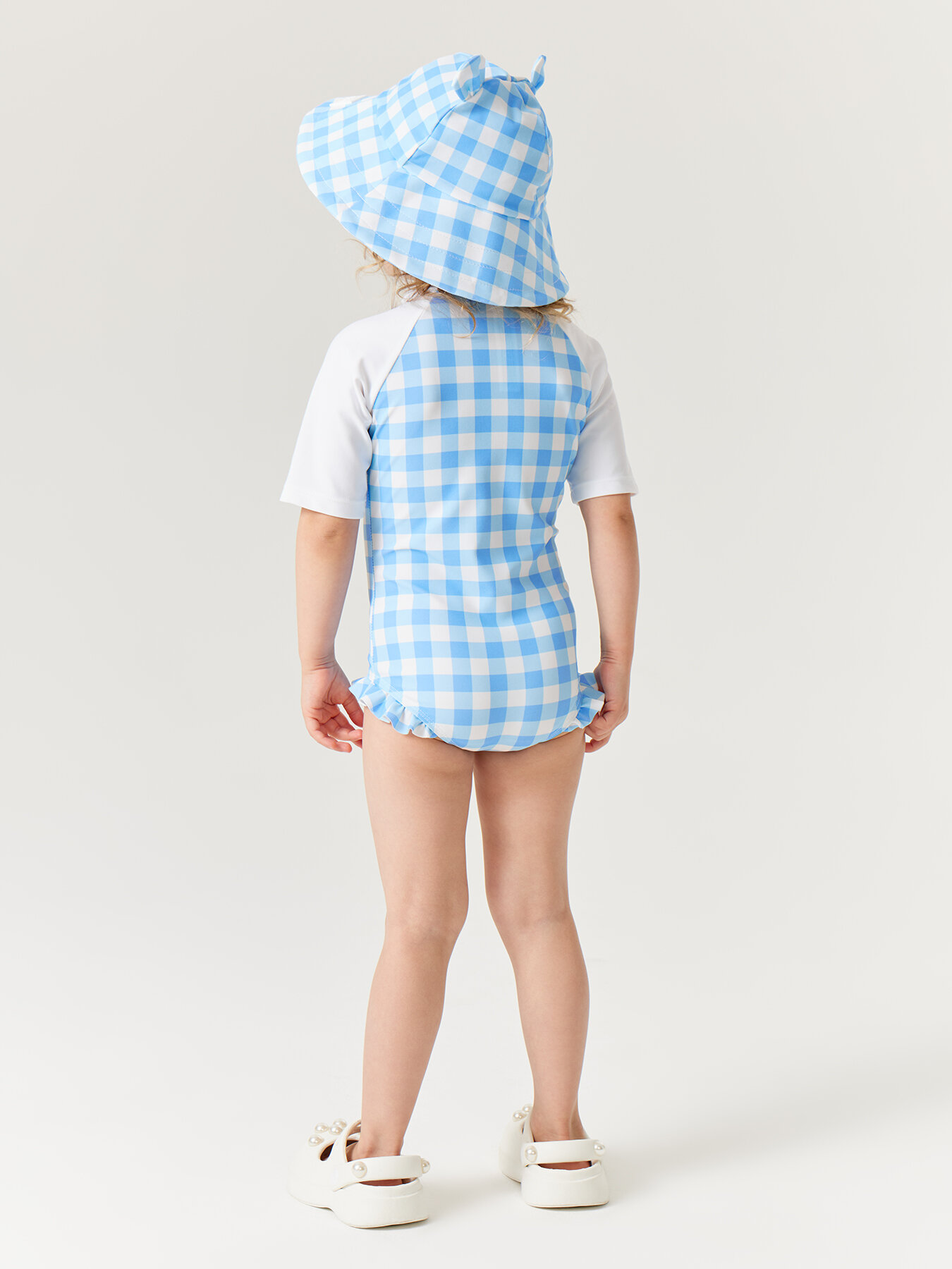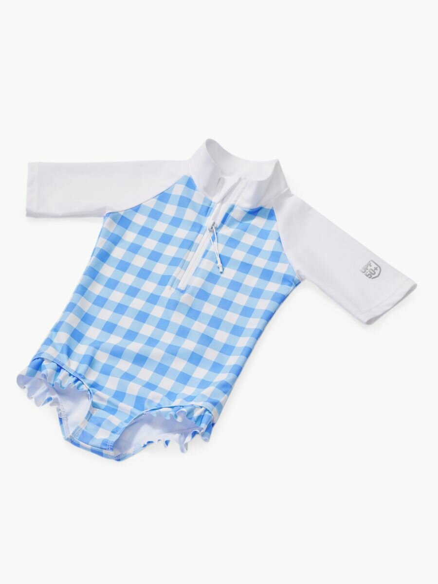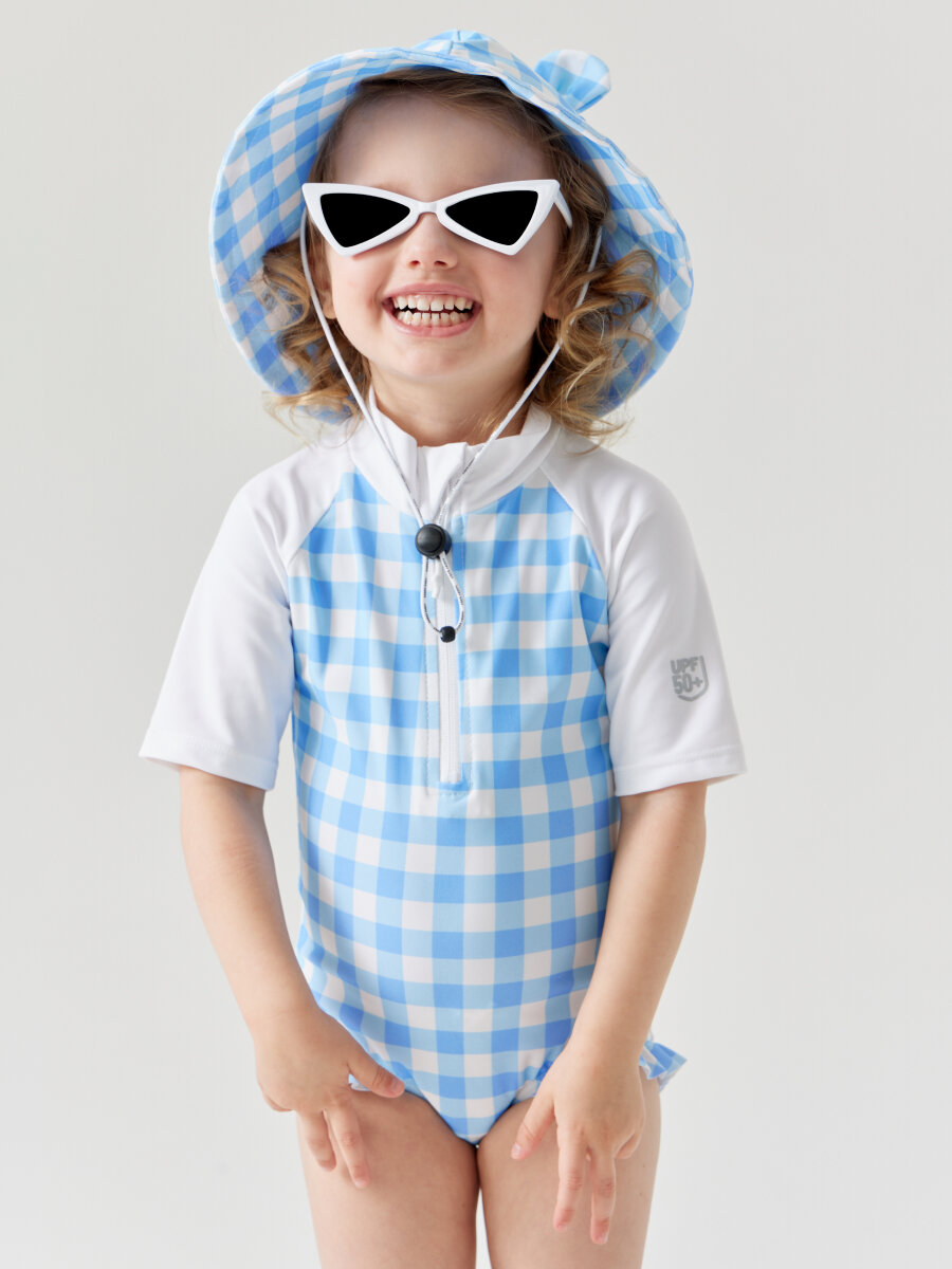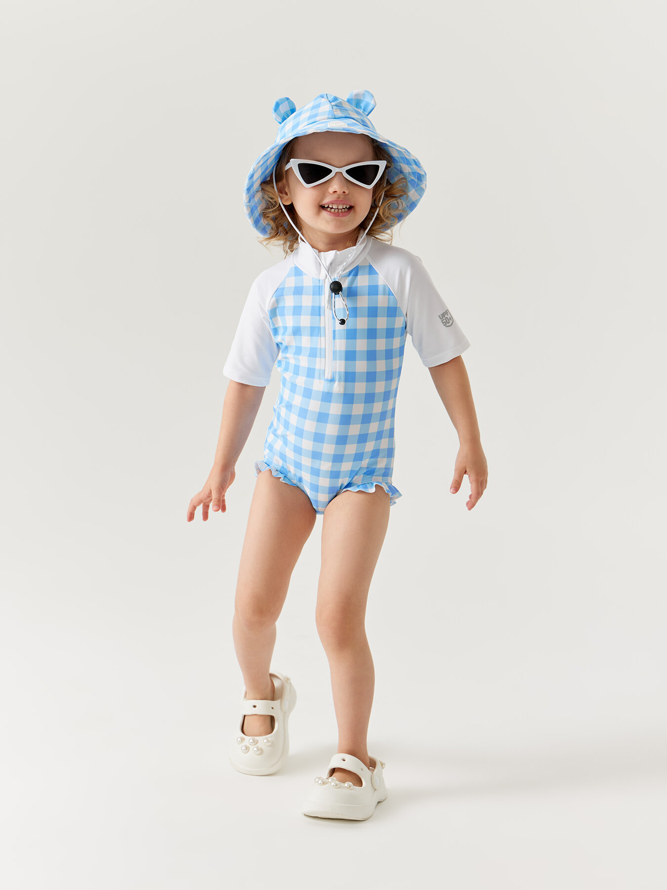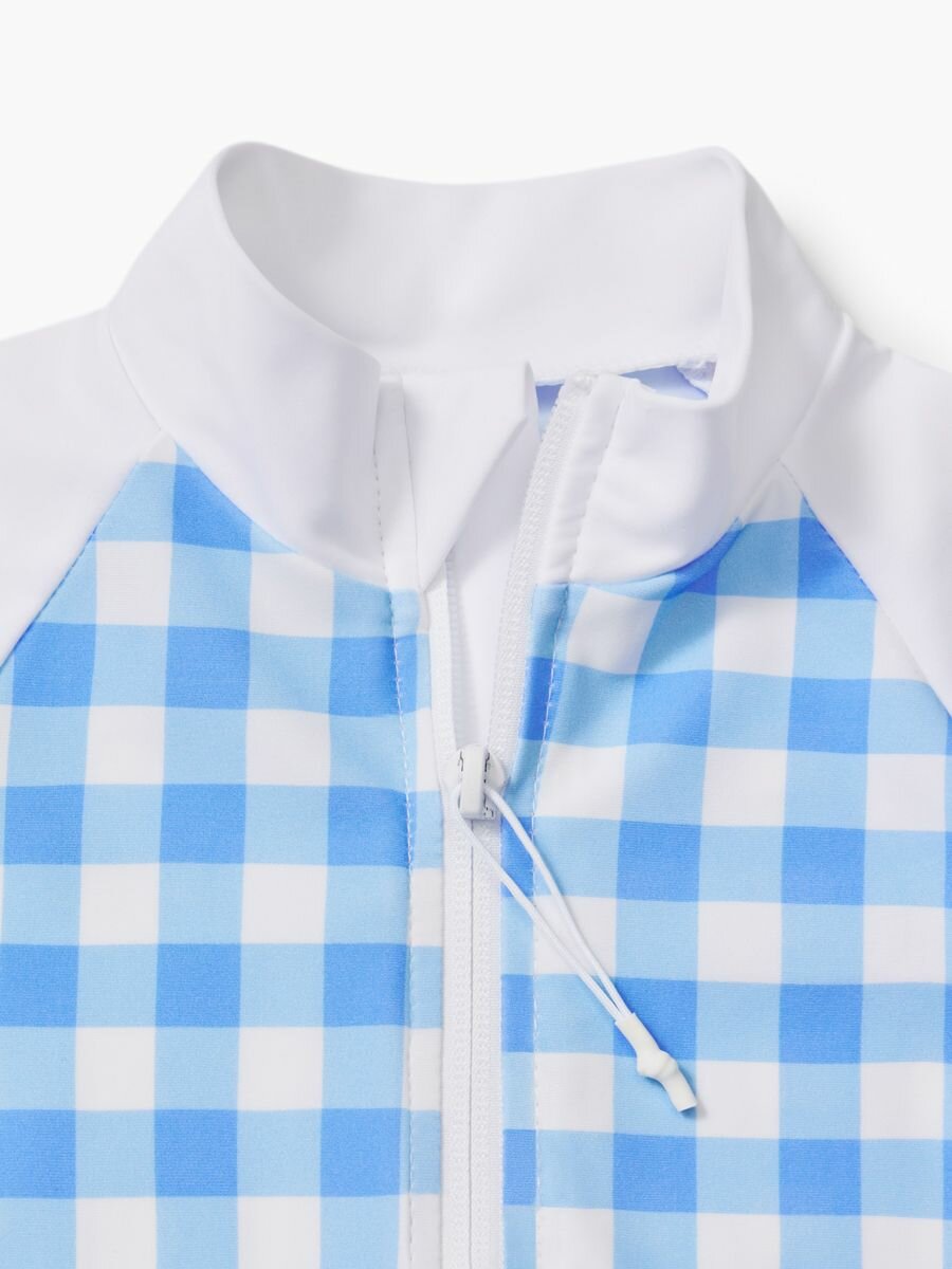 50657, Купальник слитный детский для девочек, защита от солнца UPF 50+ Happy Baby с длинным рукавом, на молнии, солнцезащита, голубой в клетку, 104-110
