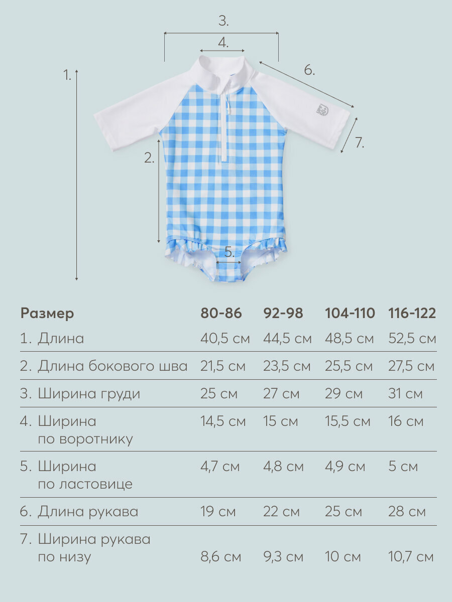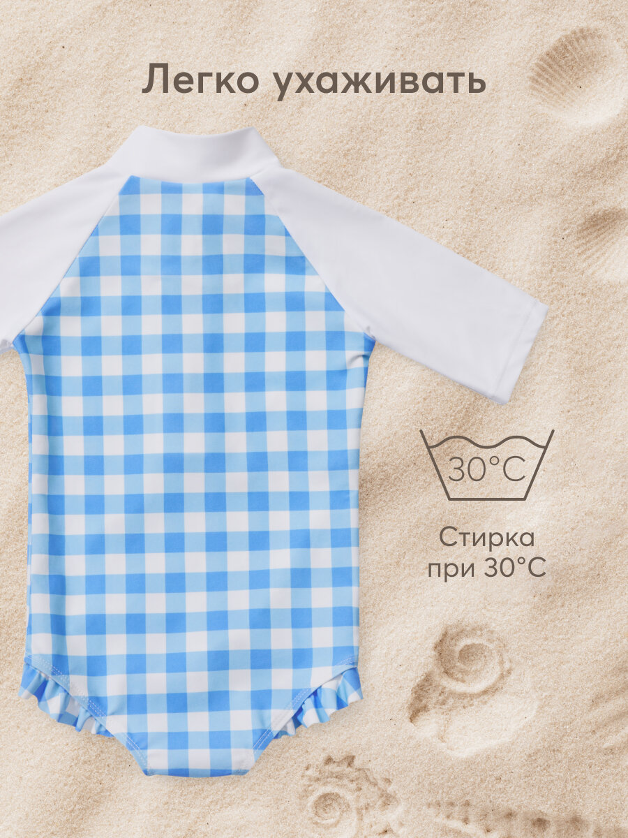 Сохранить50657, Купальник слитный детский для девочек, защита от солнца UPF 50+ Happy Baby с длинным рукавом, на молнии, солнцезащита, голубой в клетку, 116-122 интересное:
