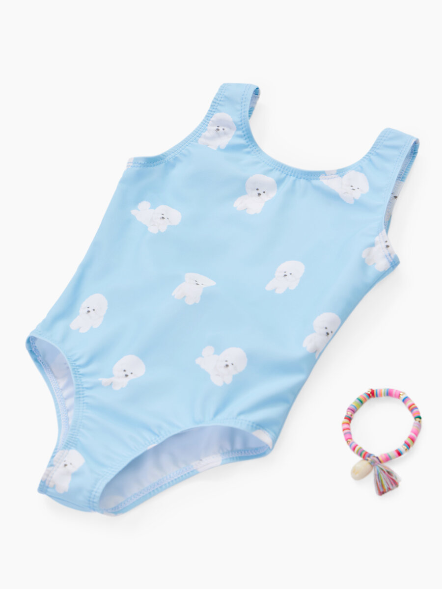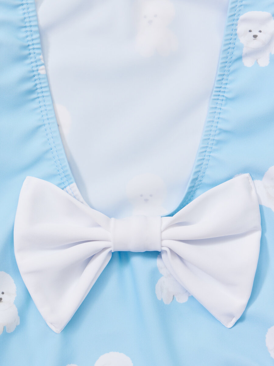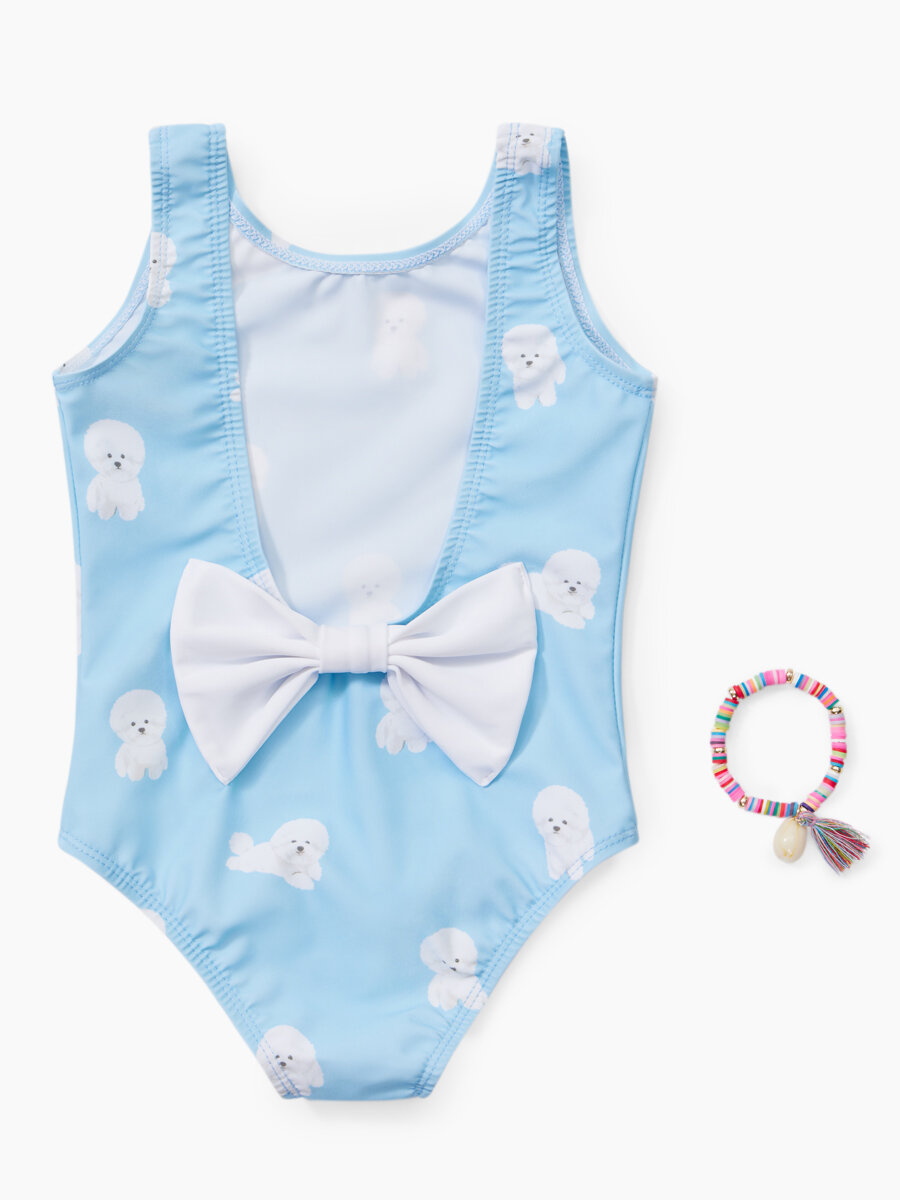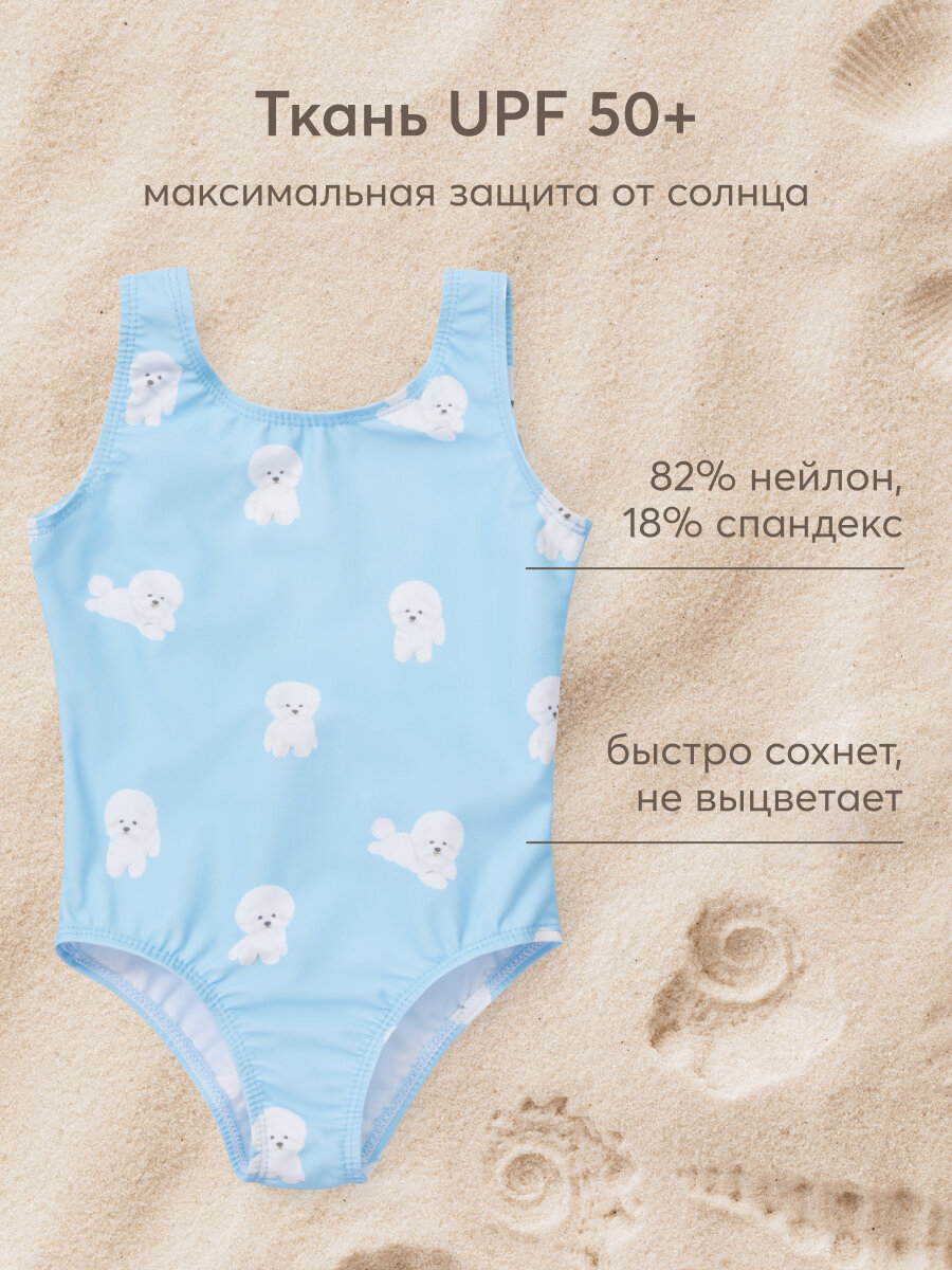 50658, Детский купальник слитный для девочек UPF50+ Happy Baby с открытой спиной, солнцезащитный, с бантом, розовый с собакой, размер 80-86