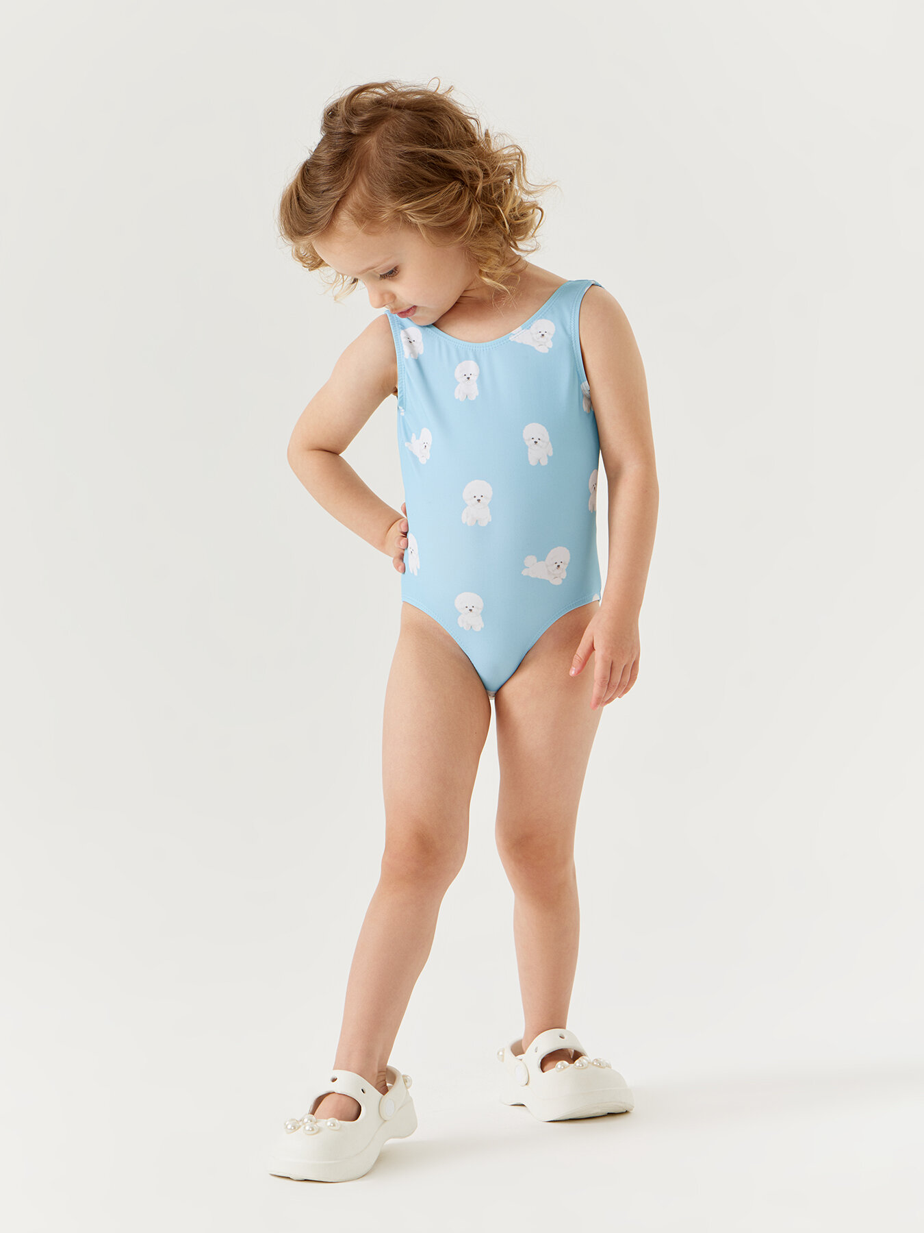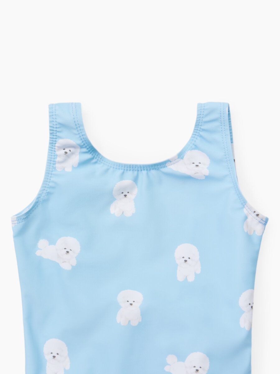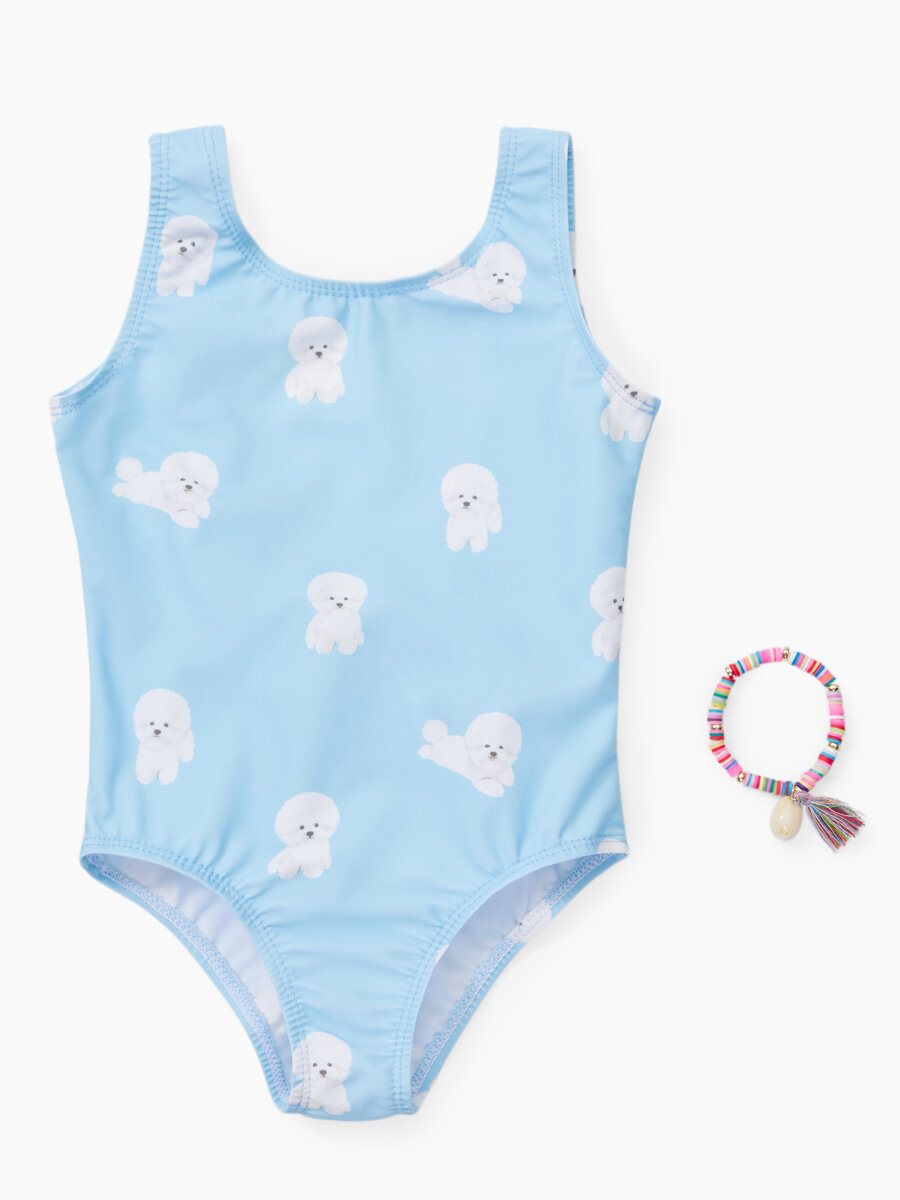 50658, Детский купальник слитный для девочек UPF50+ Happy Baby с открытой спиной, солнцезащитный, с бантом, розовый с собакой, размер 80-86
