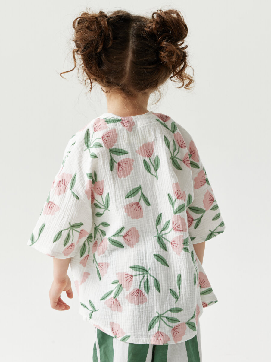 88130, Рубашка детская хлопковая Happy Baby, рубашка для мальчика и для девочки летняя, детская одежда на лето, белая с цветами, размер 128-134