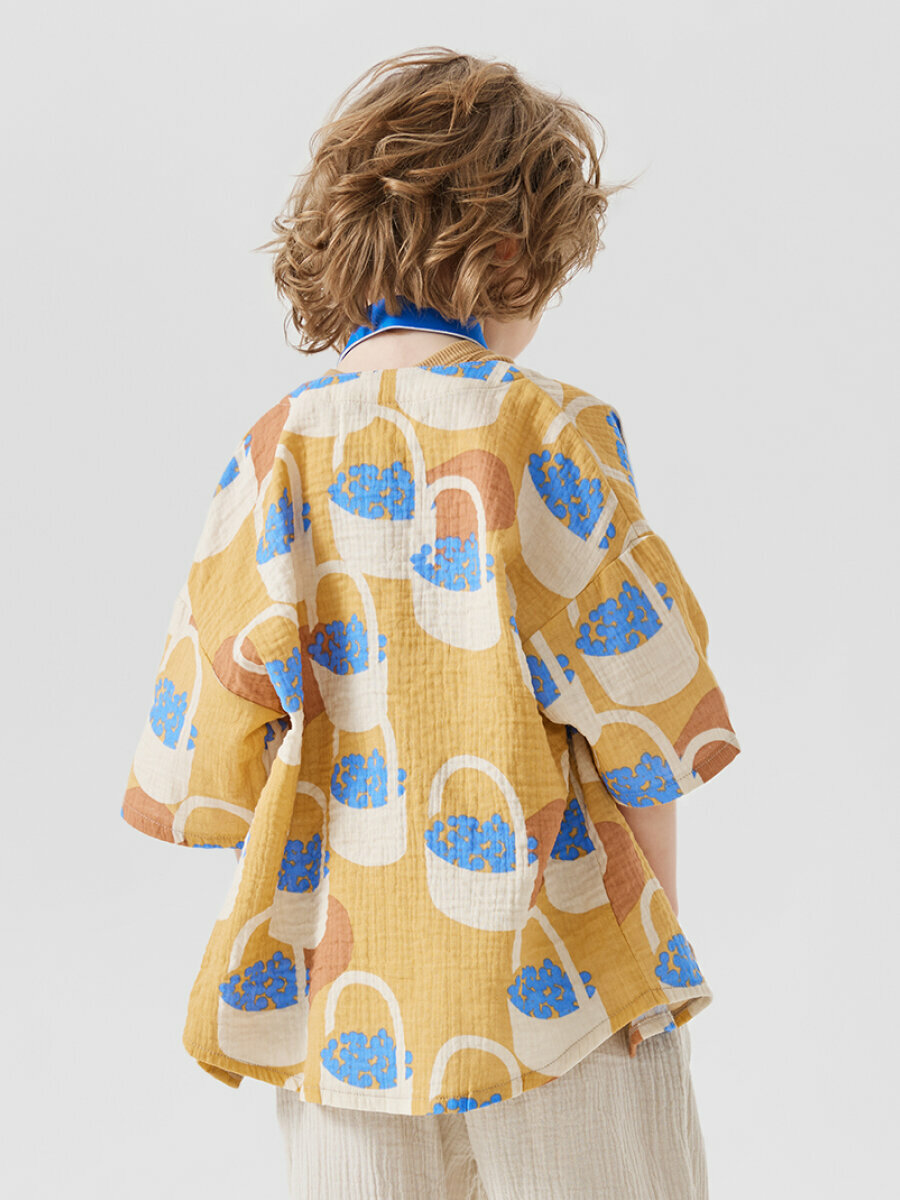 88130, Рубашка детская хлопковая Happy Baby, рубашка для мальчика и для девочки летняя, детская одежда на лето, белая с цветами, размер 122-128