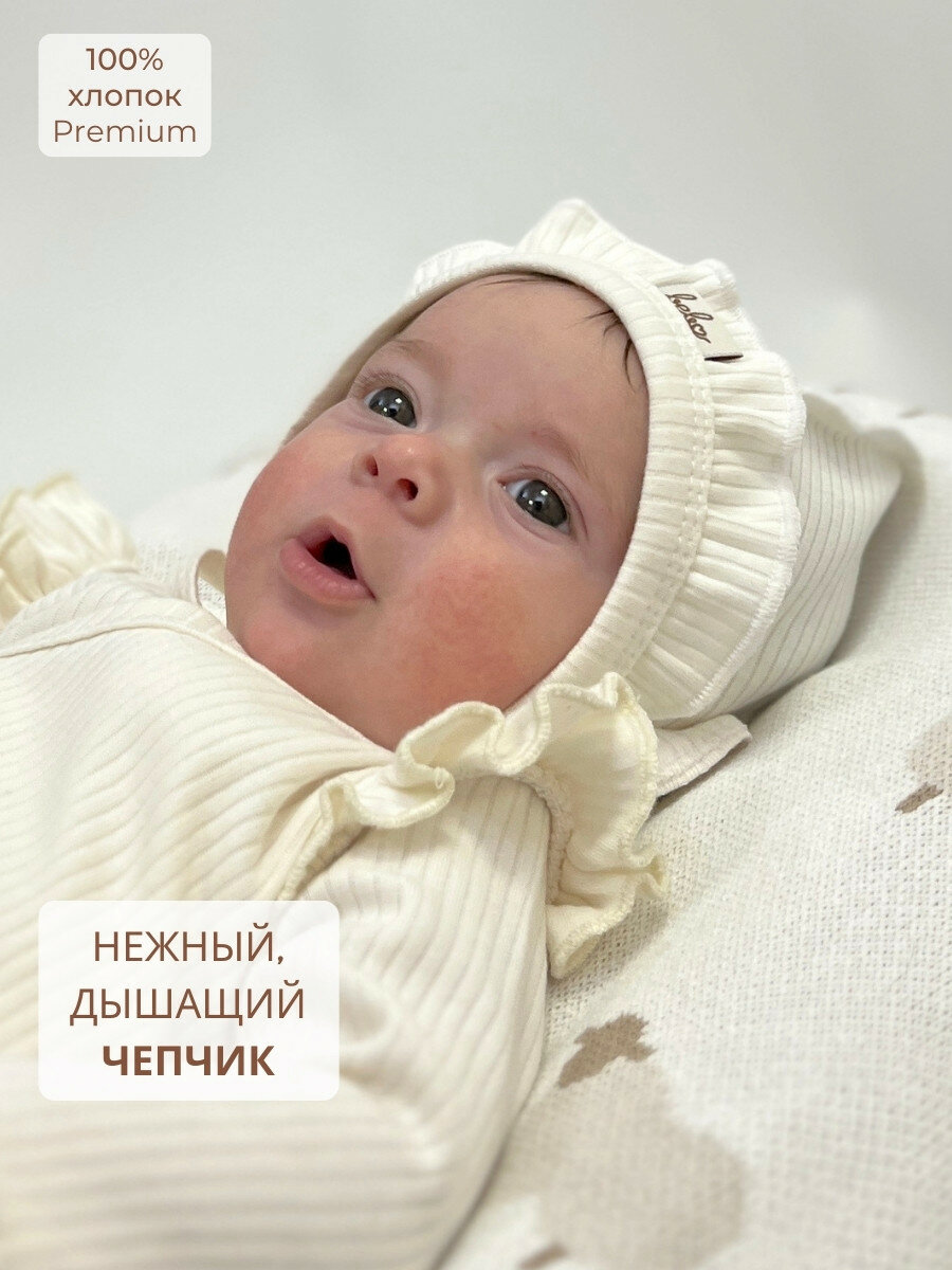 Чепчик с рюшами шапочка в рубчик для новорожденной девочки Bebo, Экрю, 36-38 р-р