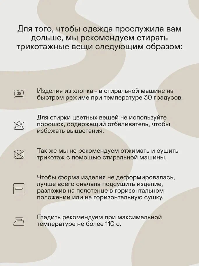 | Дополнительная информация | Стирать в стиральной машине на быстром режиме при температуре 30 градусов. Для стирки цветных вещей не используйте порошок, содержащий отбеливатель, чтобы избежать выцветания. Гладить рекомендуем при максимальной температуре не более 110 градусов. |