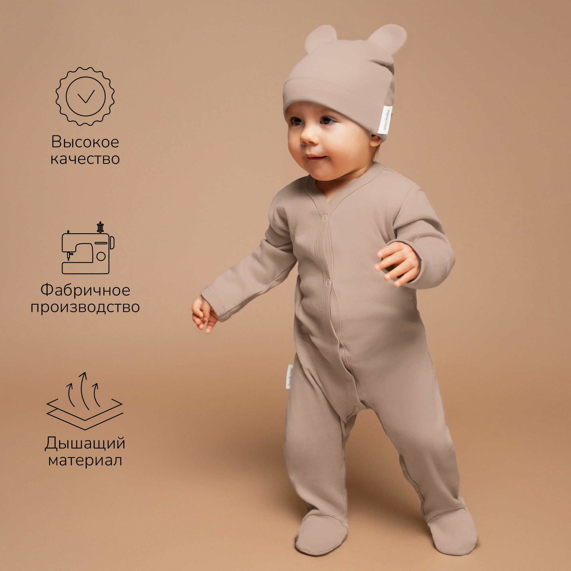 Комплект комбинезонов (слипов) детских с шапочкой Amarobaby Nature, бежевый/коричневый, размер 80