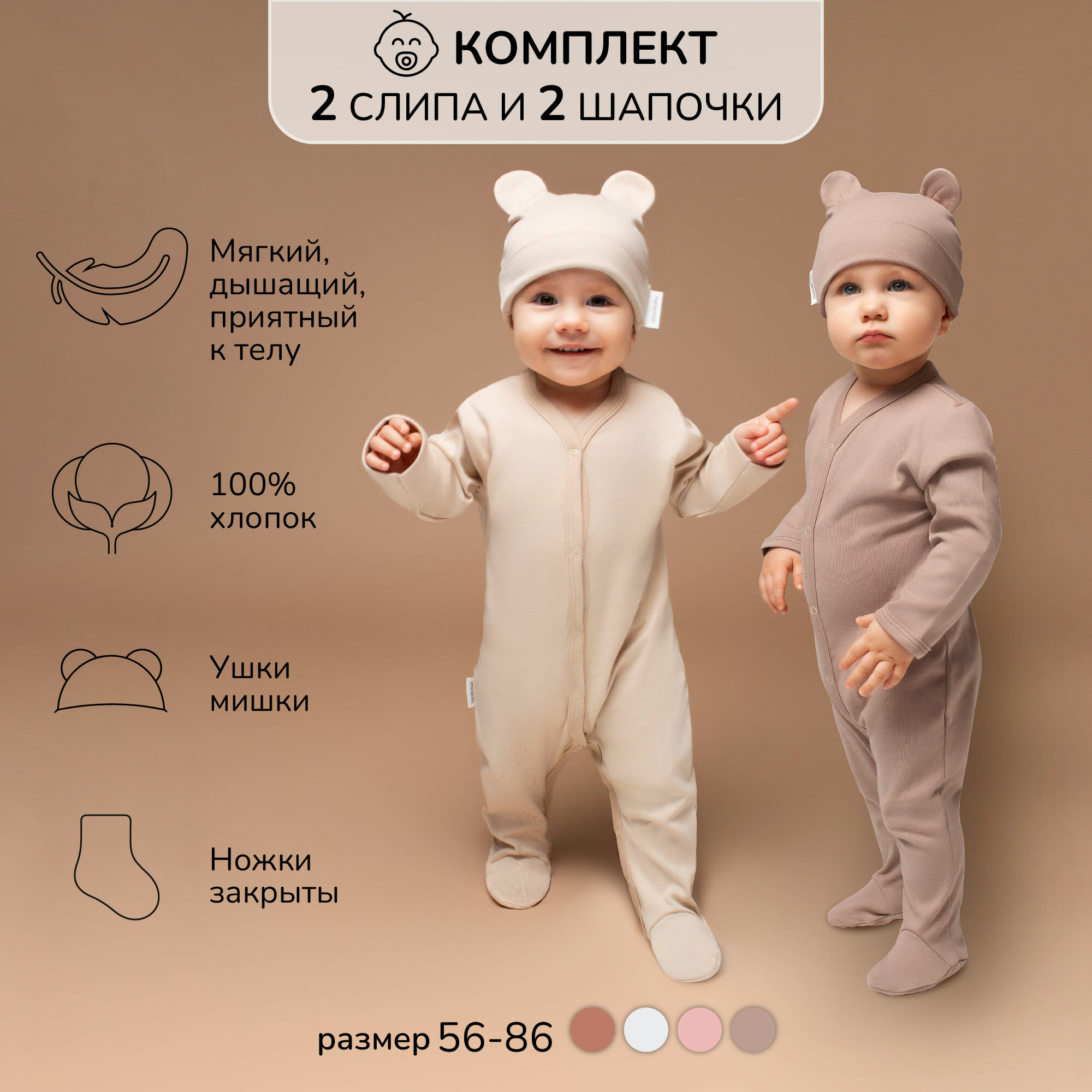 Комплект комбинезонов (слипов) детских с шапочкой Amarobaby Nature, бежевый/коричневый, размер 56