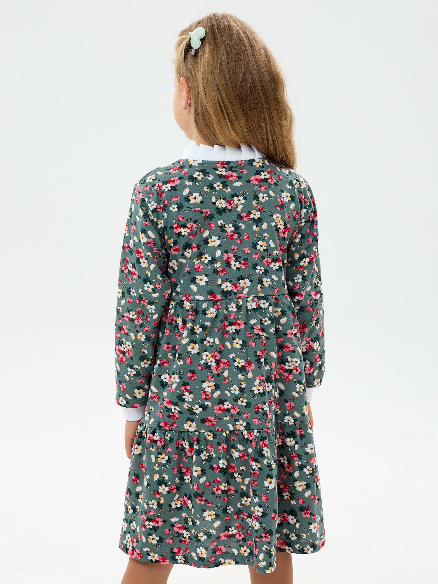 Легкое платье с длинным рукавом, зеленая полянка, размер 122