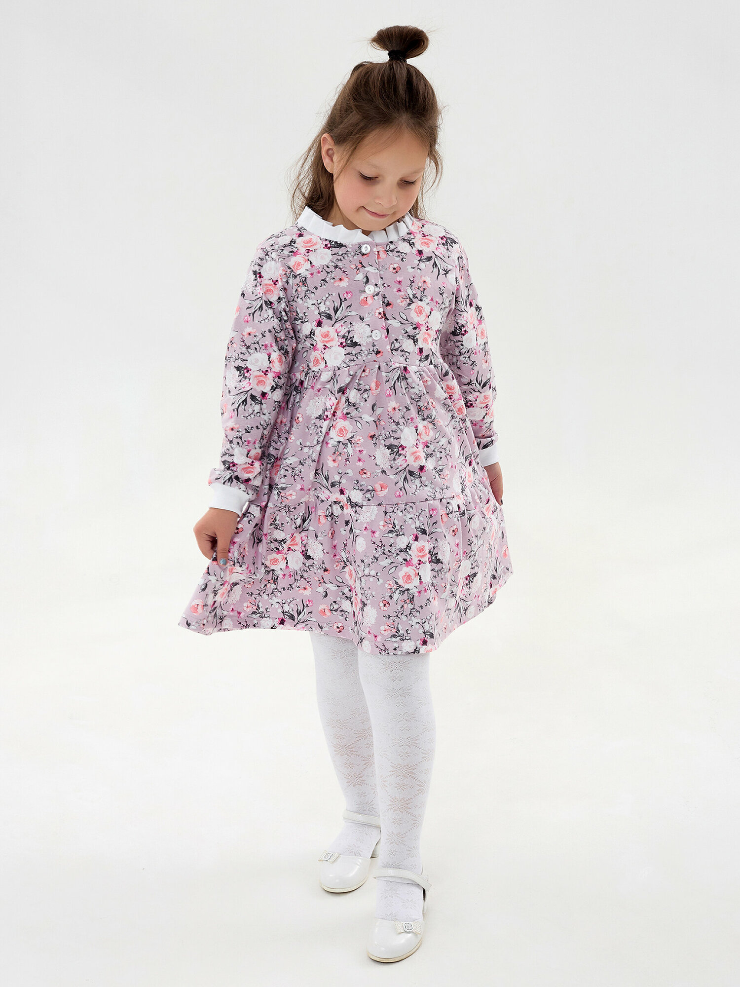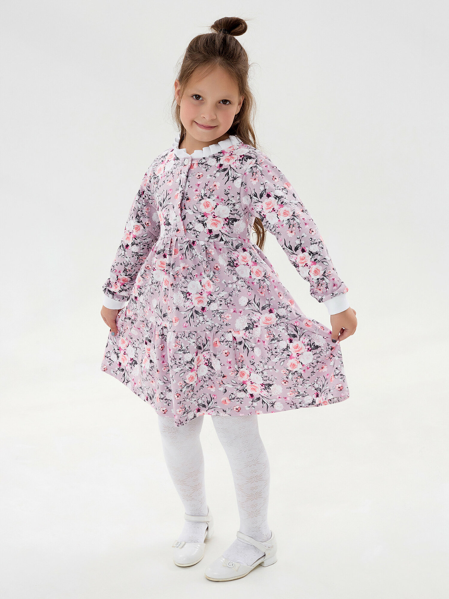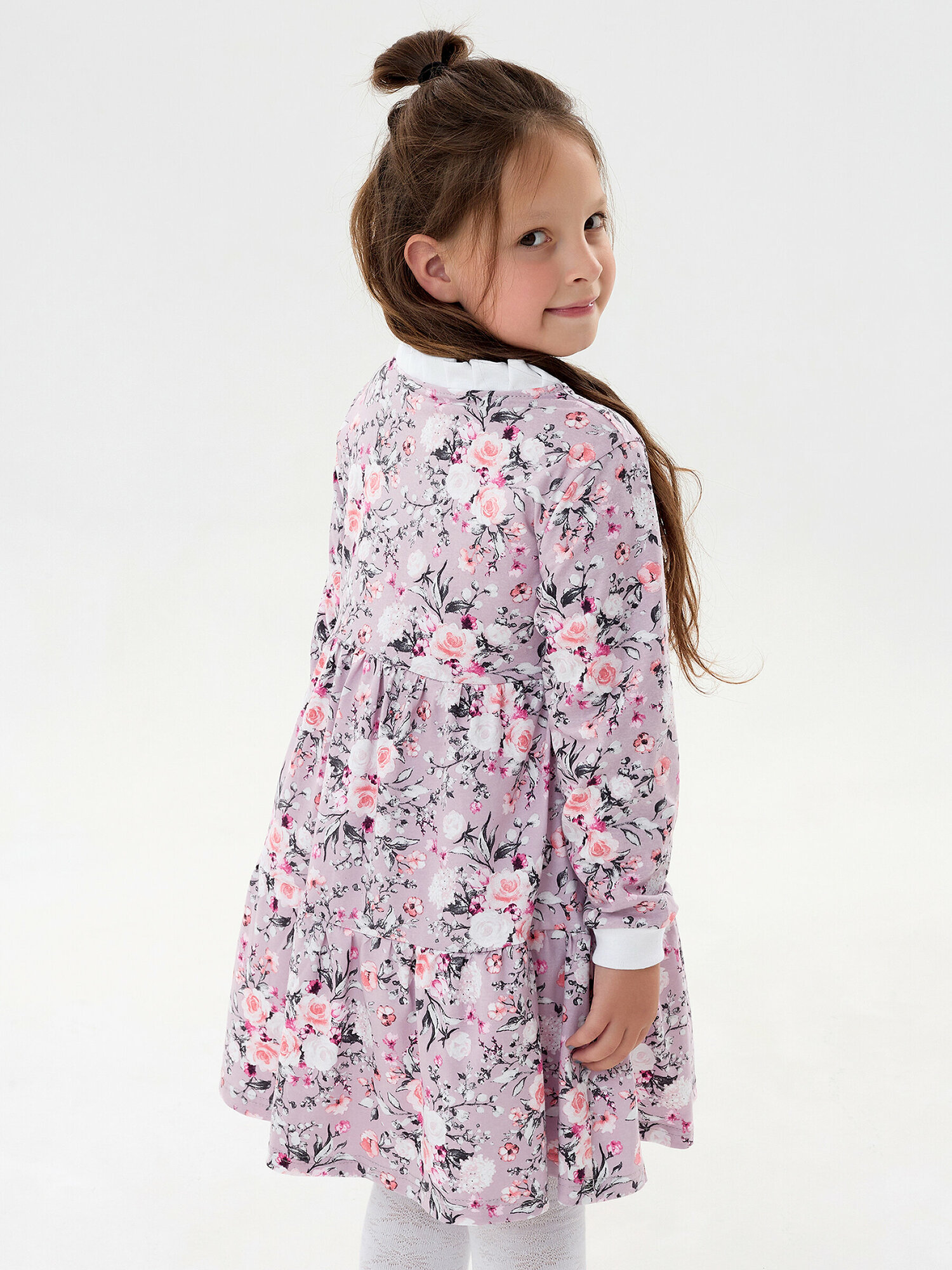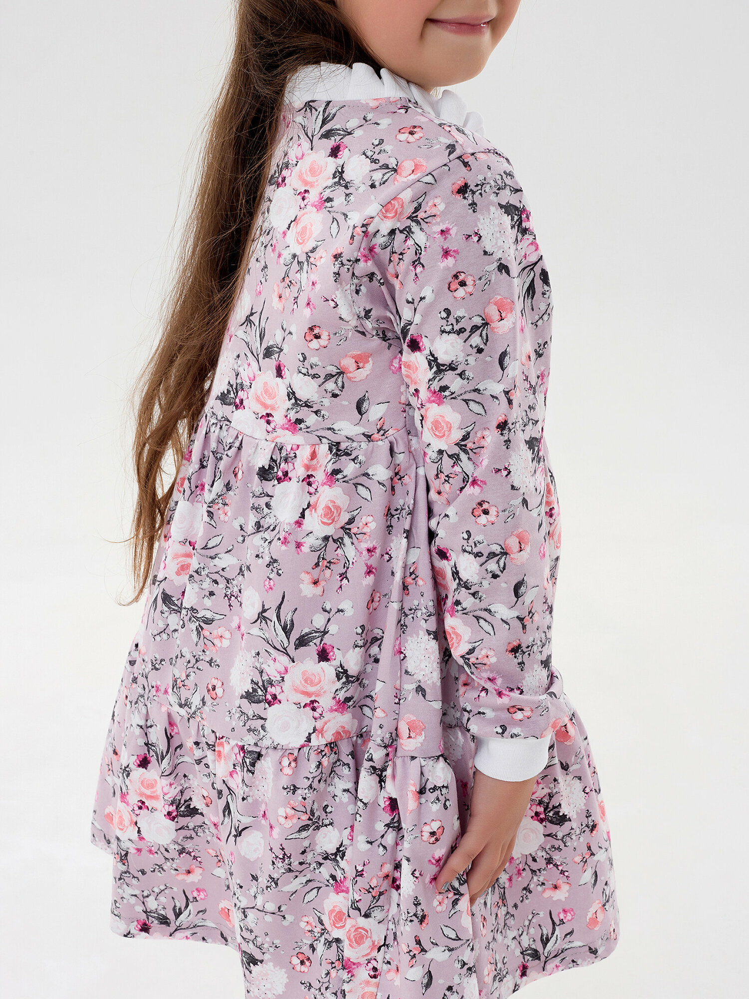 Легкое платье с длинным рукавом, фиолетовая полянка, размер 122