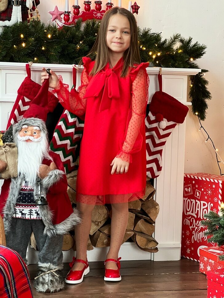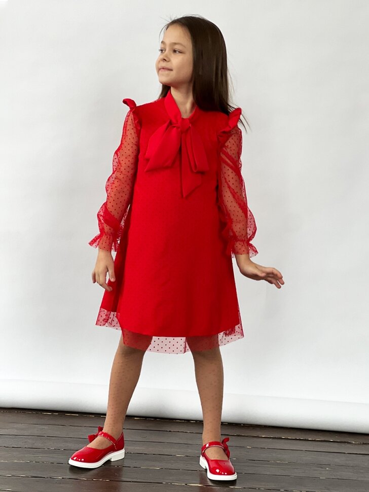 Платье для девочки нарядное бушон ST50, отделка фатин, цвет красный (122-128)
