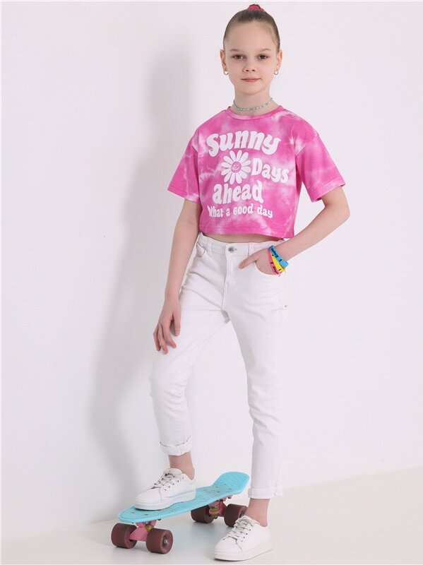 Футболка для девочки укороченная с принтом хлопок Апрель 1ДДФК4474001/1358/2542/*/3404/*/*/* розовый,белый 84-158