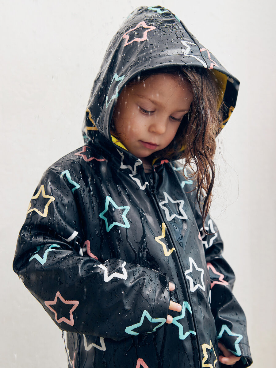 Купить 88102, Плащ детский Happy Baby дождевик, плащ-дождевик, меняет цвет под дождём, черный, разноцветный со звездами, 86-92