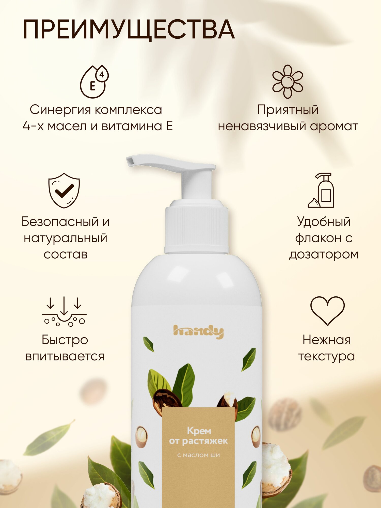 | Состав | вода / масло ши / миндальное масло / цетеариловый спирт / кокосовое масло / глицерин / эмульсионный воск / глицерил моностеарат / этилгексил стеарат / эфир глицерина / коллаген / д пантенол / витамин е / лециэмульгель / экстракт каштана / эластин / отдушка / масло жожоба / ксантановая камедь / бета-ситостерол / сквален. |