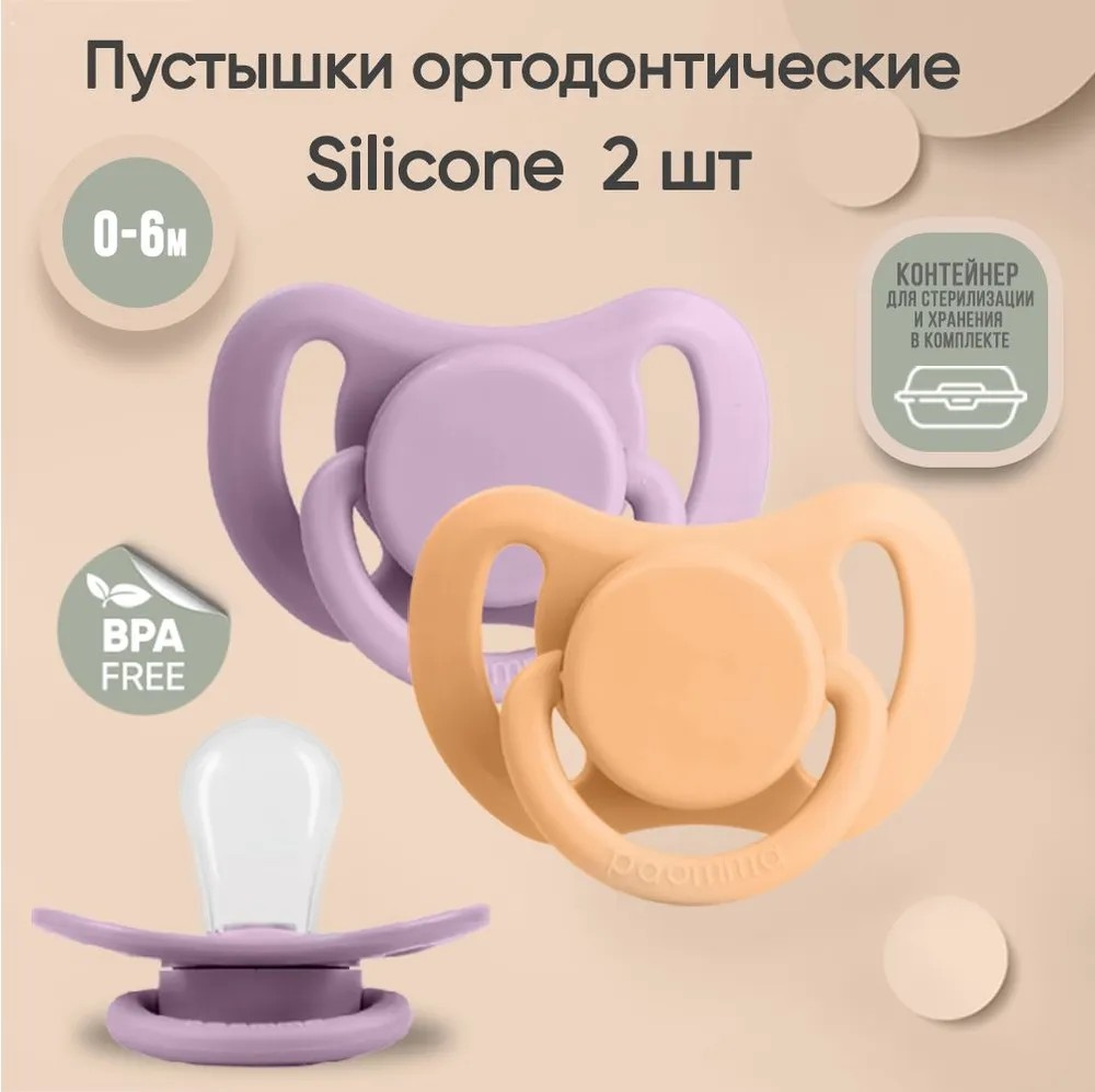 Купить Набор силиконовых пустышек Paomma 0-6 мес., 2 шт. в контейнере, lilac/lemon