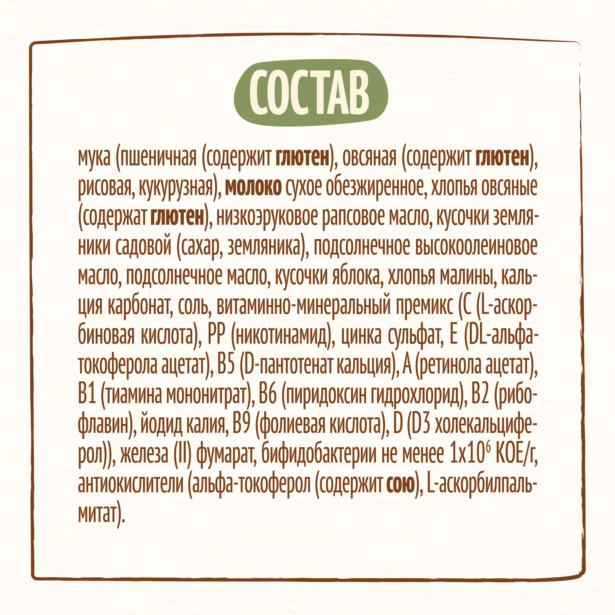 | Состав | мука (пшеничная (52,4 %) (содержит глютен) / овсяная (7,2 %) (содержит глютен) / рисовая (1,8 %) / кукурузная (1,8%)) / молоко сухое обезжиренное (16,6 %) / смесь растительных масел (низкоэруковое рапсовое / подсолнечное высокоолеиновое / подсолнечное) / антиокислители (L-аскорбилпальмитат / альфа-токоферол / лимонная кислота) / хлопья овсяные (5,2 %) (содержат глютен) / кусочки земляники садовой (3,1 %) (сахар / земляника / крахмал кукурузный) / хлопья малины (1 %) / кусочки яблока (1 %) / минеральные вещества (кальция карбонат / железа (II) фумарат / цинка сульфат / йодид калия) / витамины (С (L-аскорбиновая кислота) / E (DL-альфа-токоферола ацетат) / РР (никотинамид) / B5 (D-пантотенат кальция) / A (ретинола ацетат) / В1 (тиамина мононитрат) / В6 (пиридоксин гидрохлорид) / В2 (рибофлавин) / B9 (фолиевая кислота) / D (D3 холекальциферол)) / бифидобактерии не менее 1х10^6 КОЕ/г |