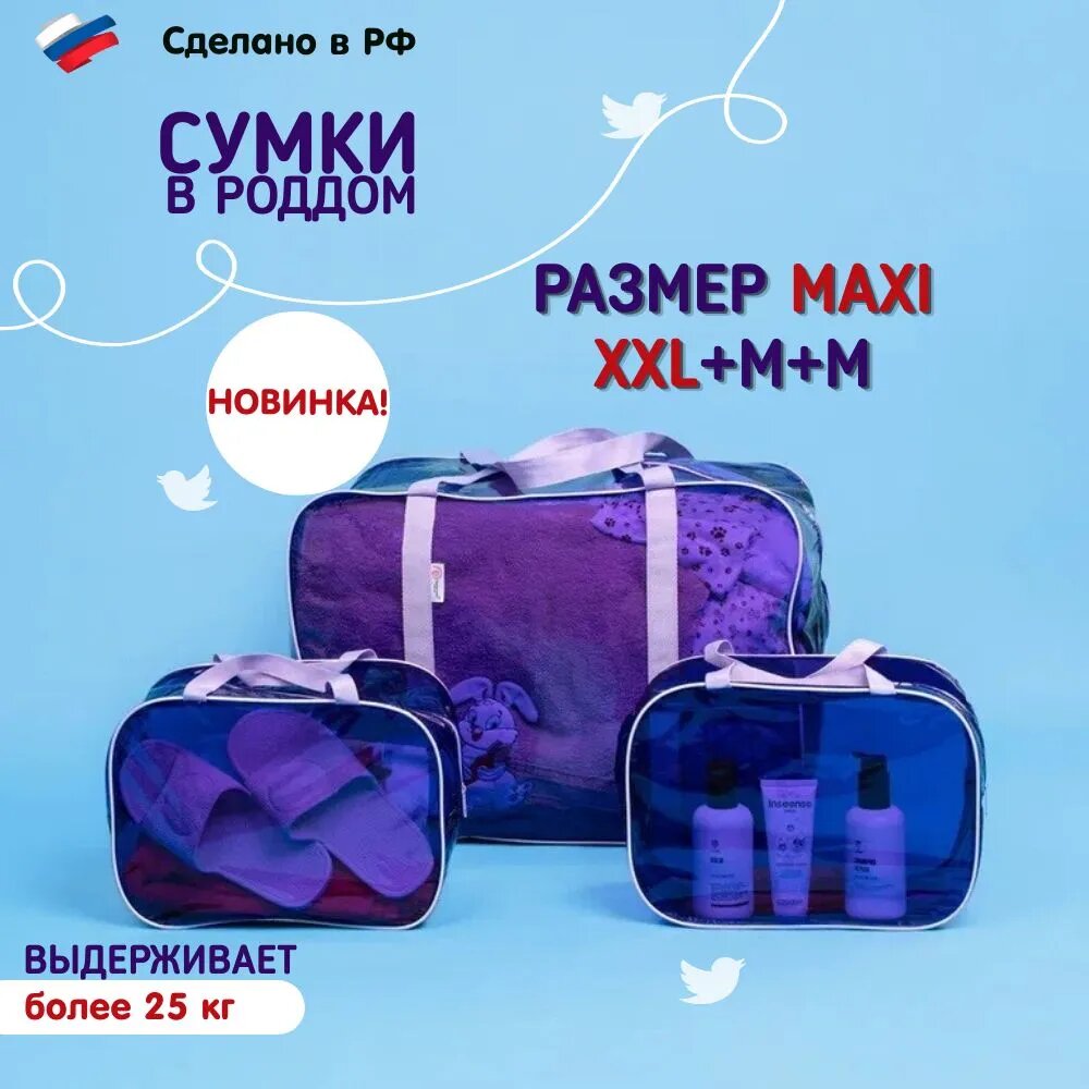 СохранитьСумка в роддом, "здравствуй, мама!", мега большая XХL и 2 средние, цвет темная сирень, набор из 3 шт. интересное: