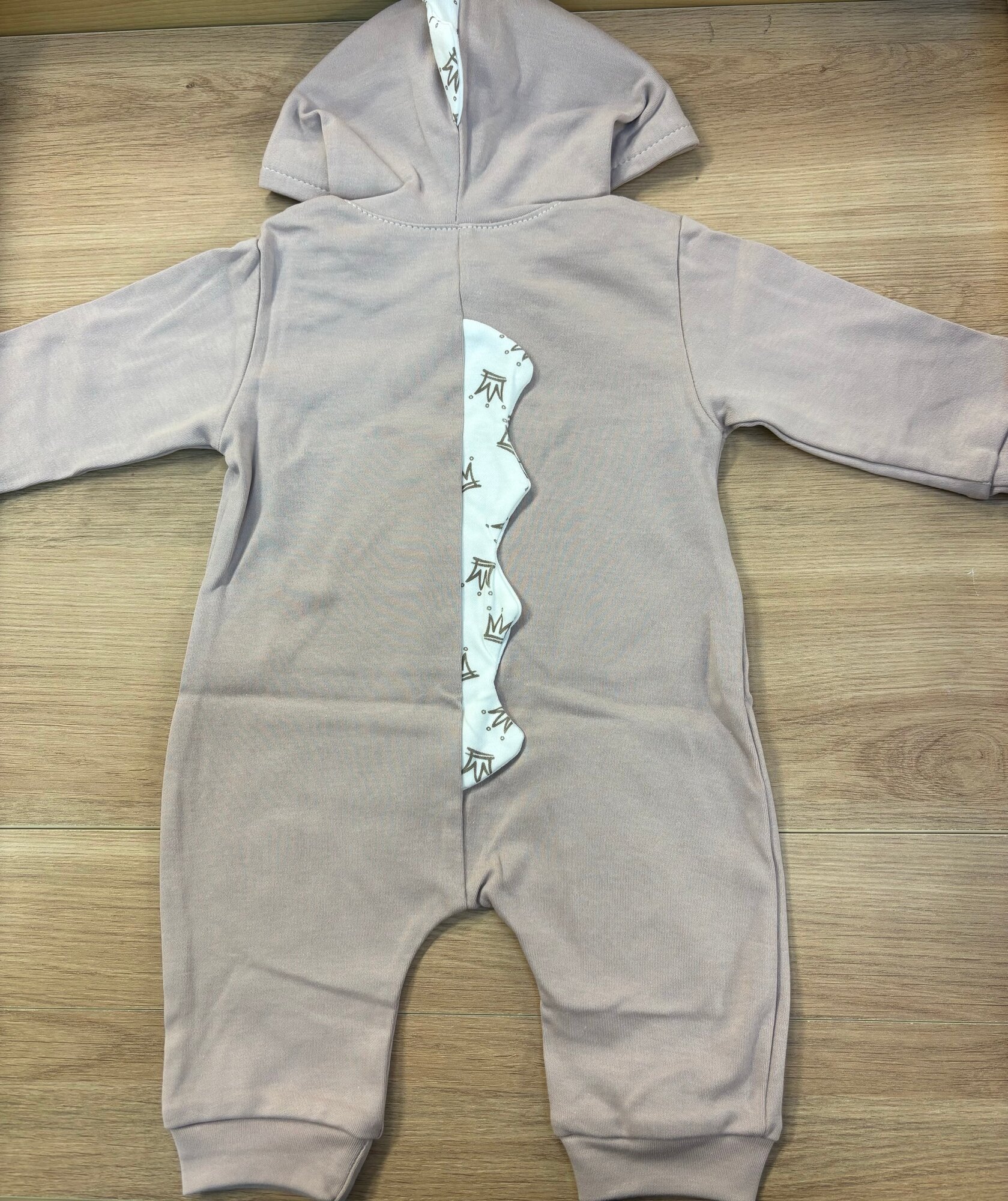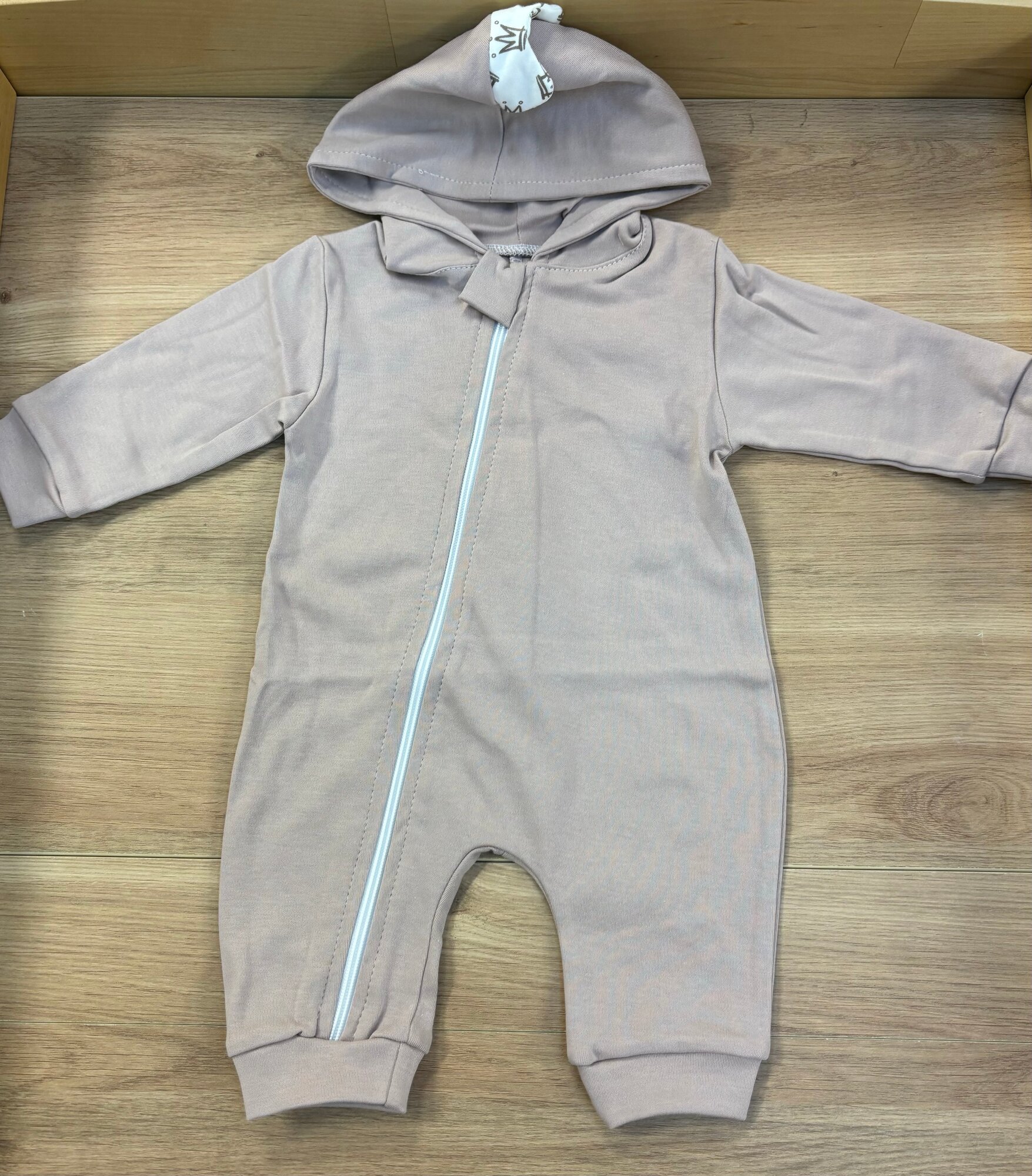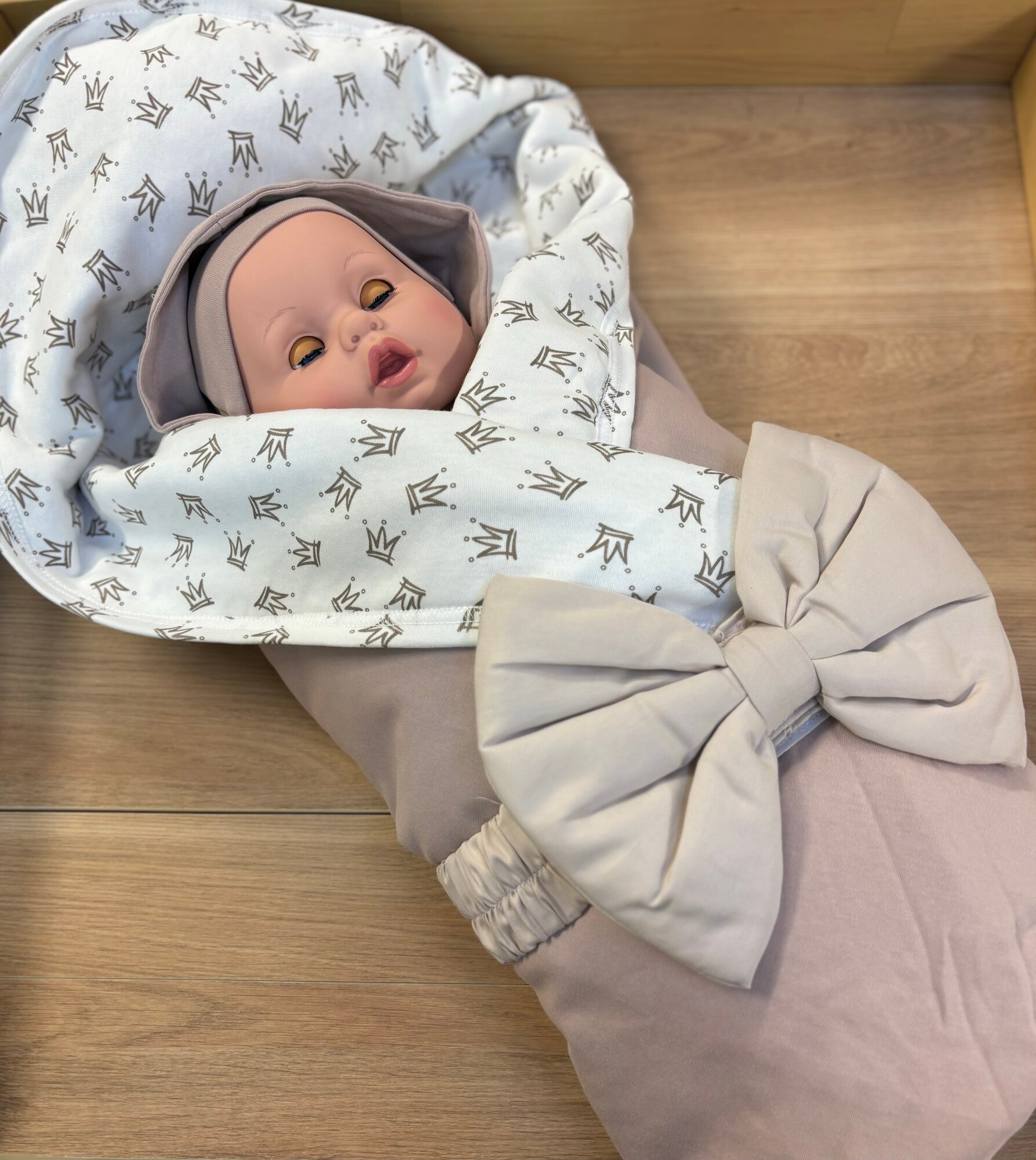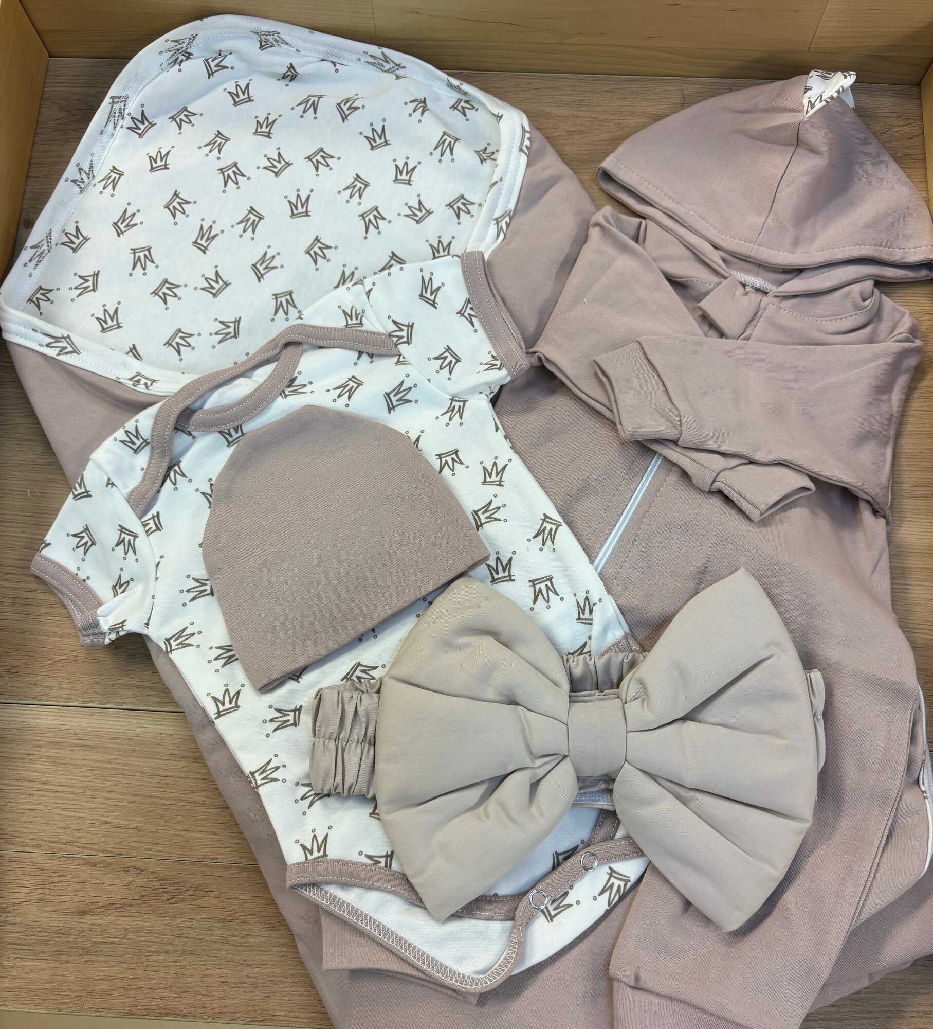 Комплект одежды на лето для выписки бежевый с коронами интересное:
