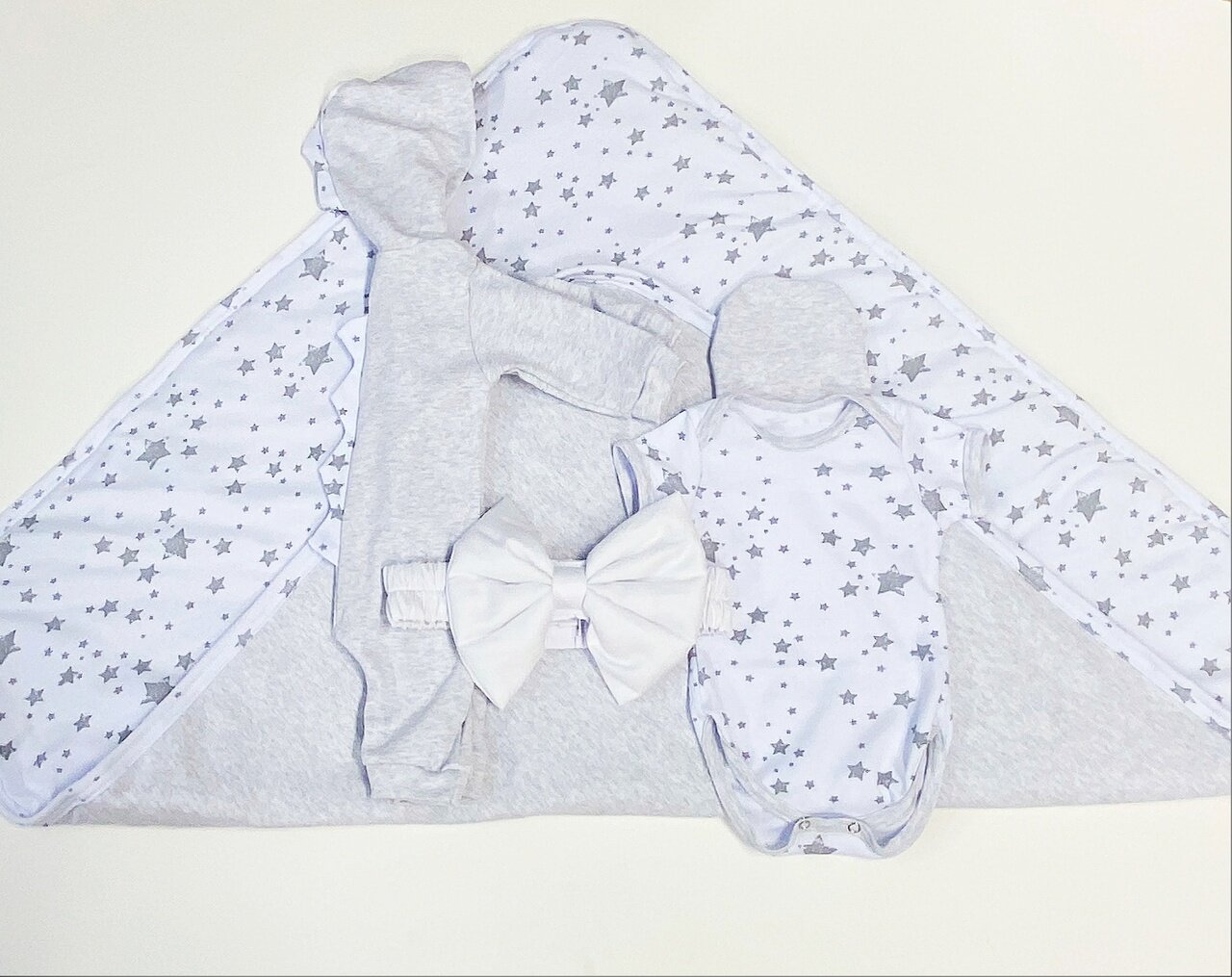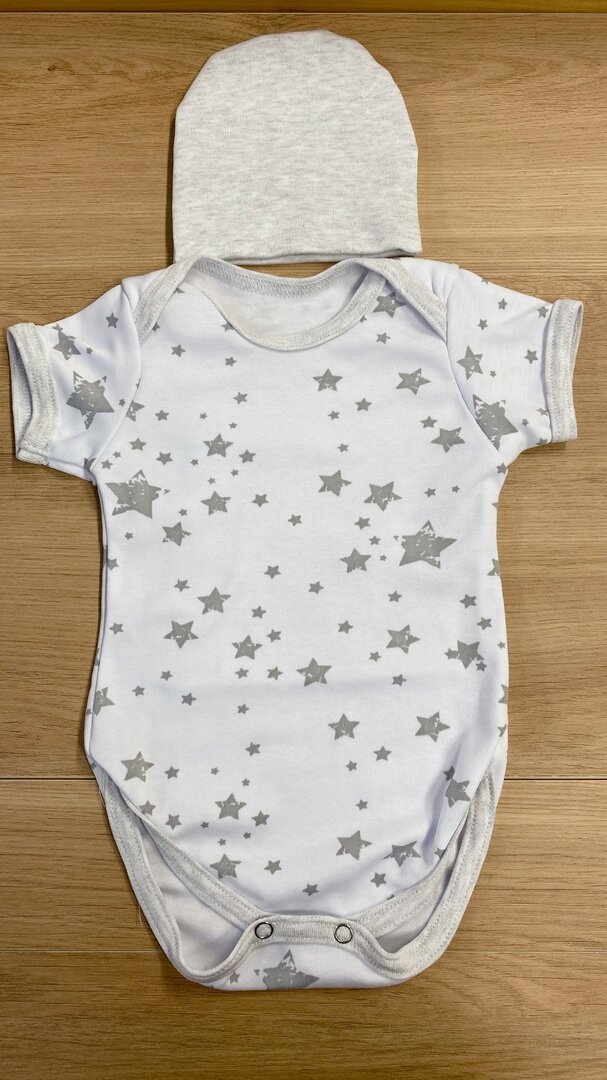 Купить Комплект одежды на лето для выписки из роддома серый звезды