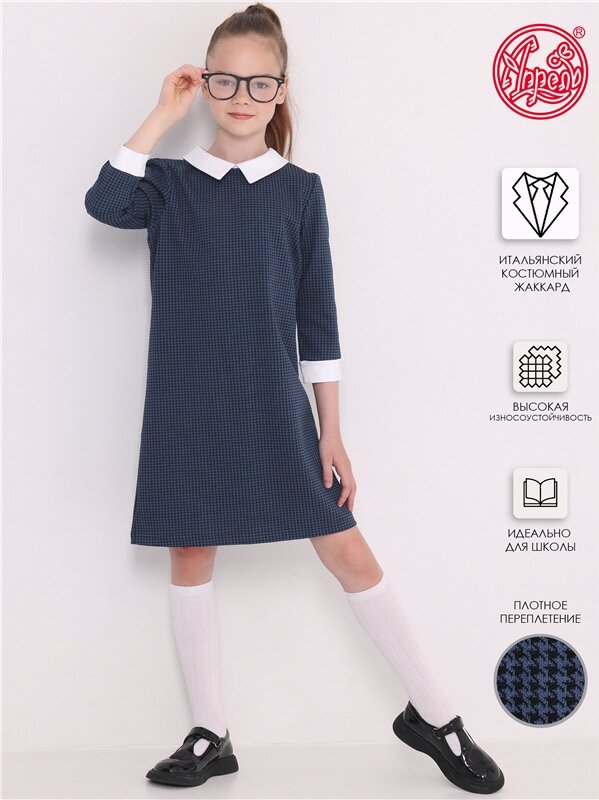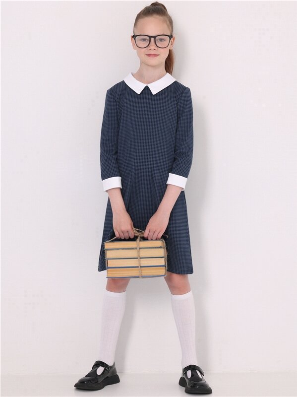 Платье для девочки школьное синее трикотажное с воротником Апрель 1ДПД868858/989/2151/*/1852/*/*/* синий,белый 76-146