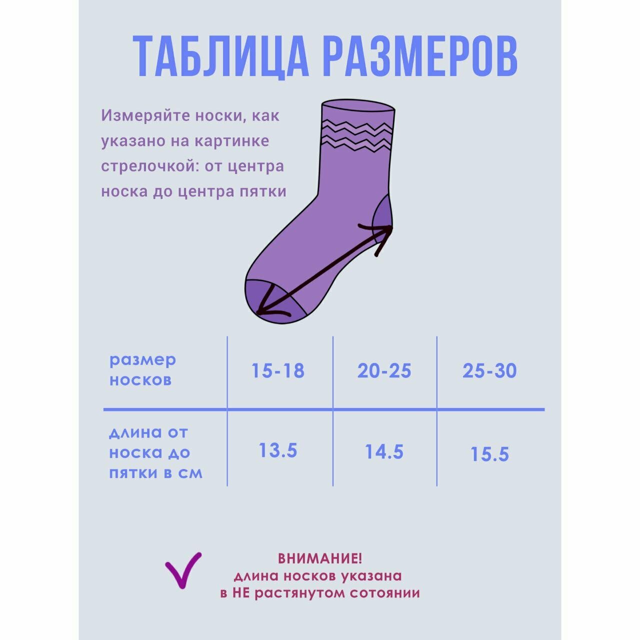 | Дополнительная информация | на выбор имеется 3 размера носков: 15-17 (до 1 годика), 18-26 (1-6 годика), 27-30 (6-9 лет). |
