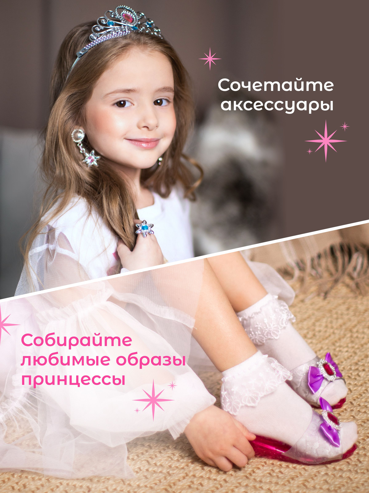 | Подробная комплектация | диадемы 2 шт, серьги 2 пары, кольца 2 шт, туфли 4 пары, подарочная коробка 1 шт |