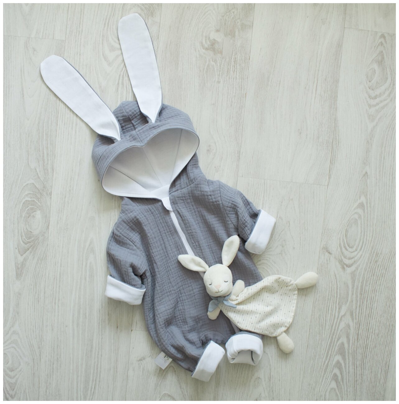 Комбинезон из муслина детский 68 размер (3-6 мес), серый, MAMINY ZAPISKY, с капюшоном