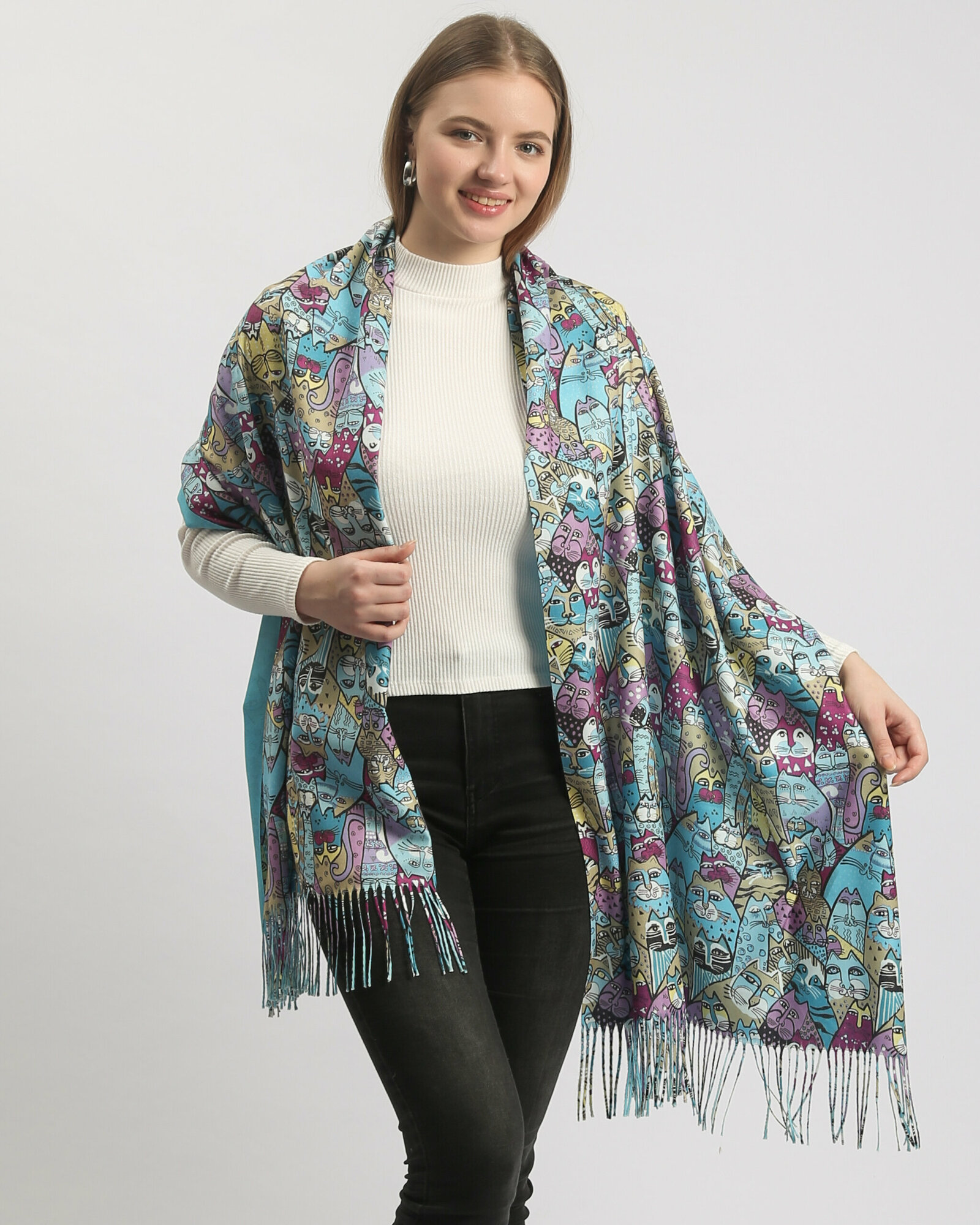 Купить Палантин женский теплый двухсторонний с котиками Lavantti, бирюзовый