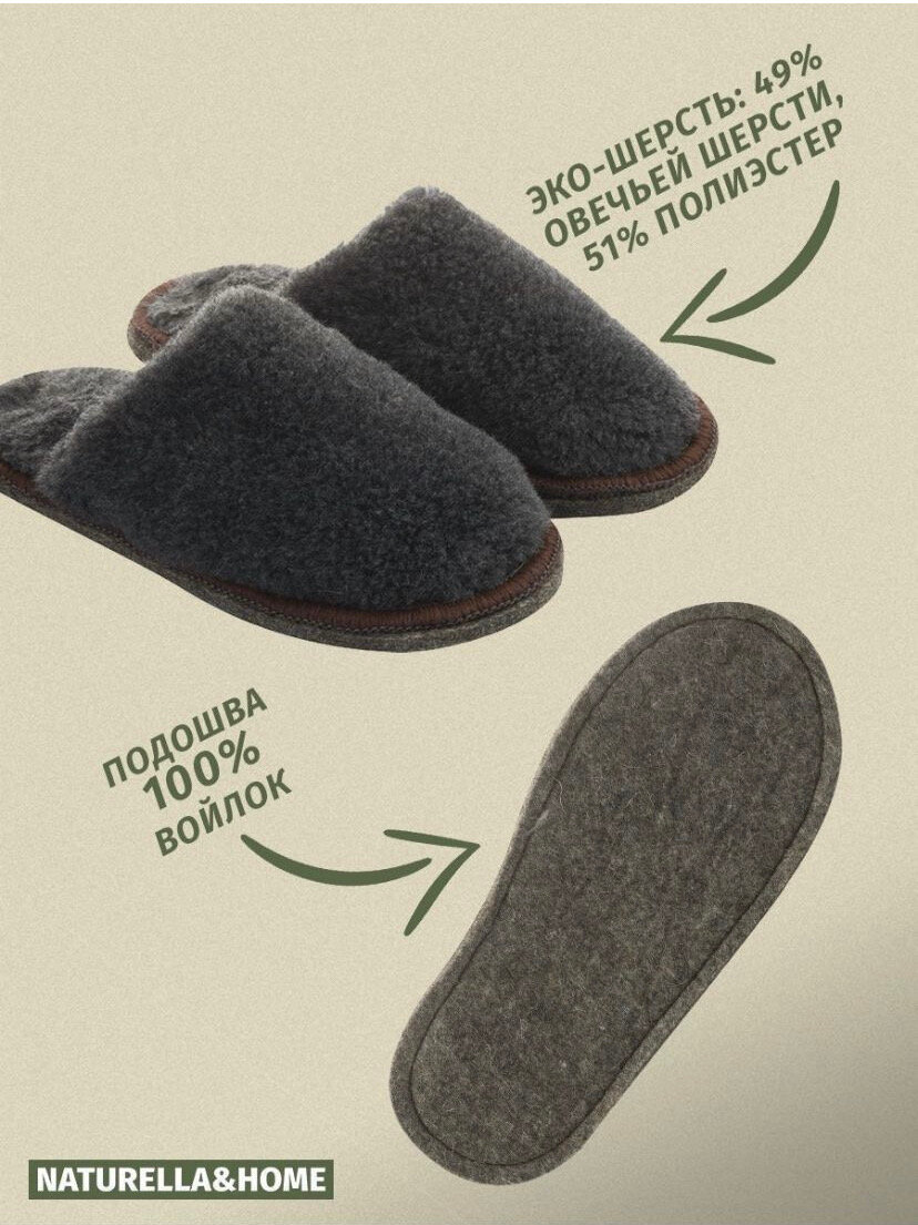 Тапочки домашние из овечьей шерсти на подошве из войлока, тапки меховые плюшевые, Naturella&Home, серые, 43-44
