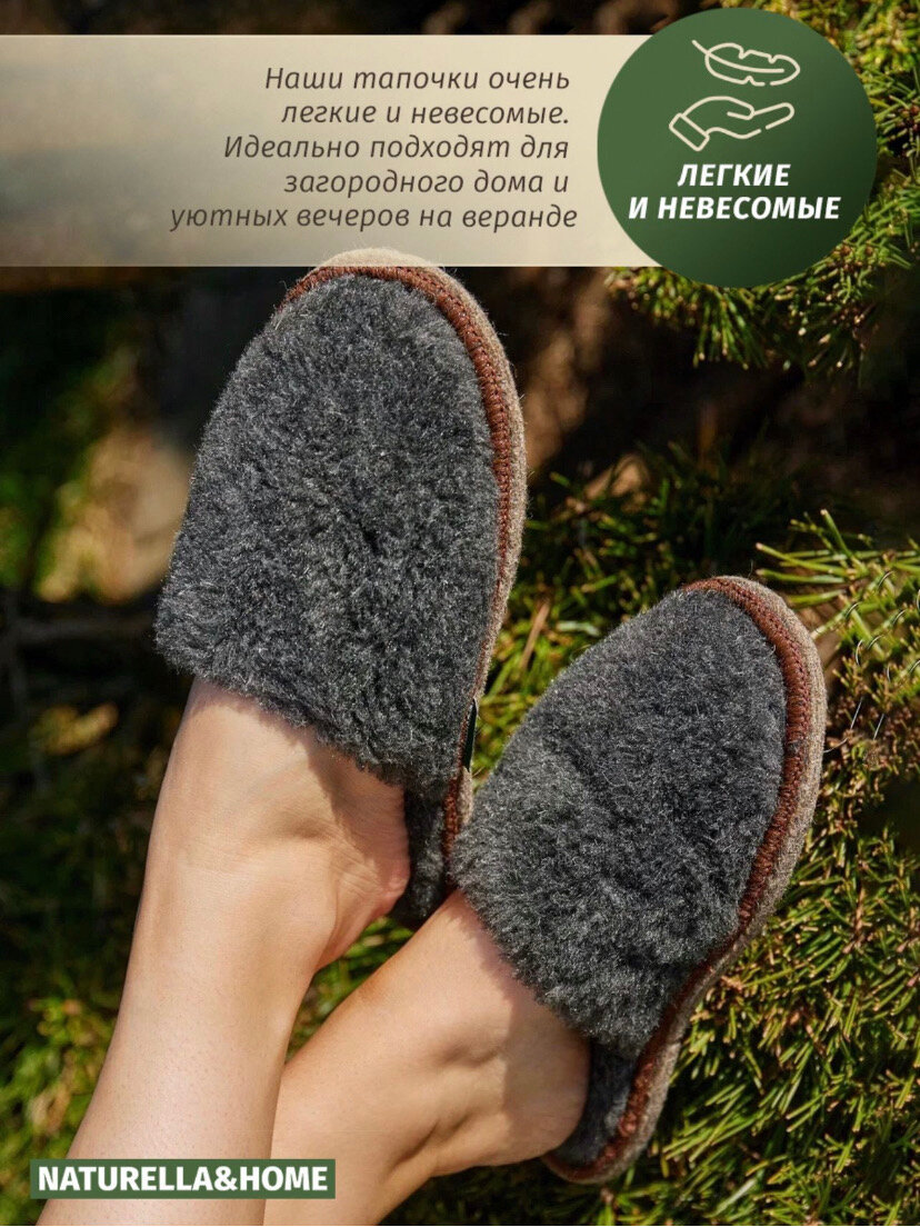 Тапочки домашние из овечьей шерсти на подошве из войлока, тапки меховые плюшевые, Naturella&Home, серые, 37-38