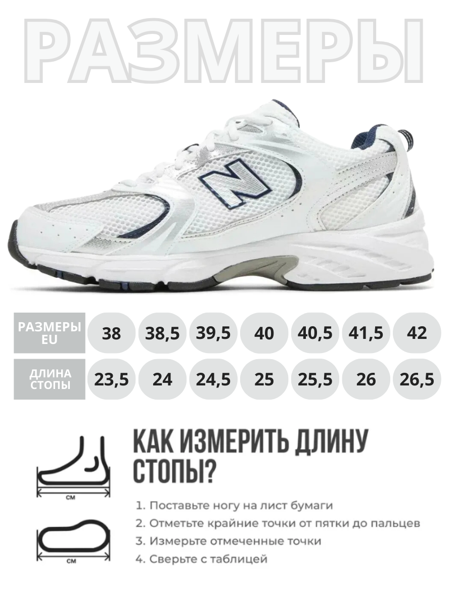 Кроссовки New Balance "530" - белые с серебряными вставками 44.5 eu