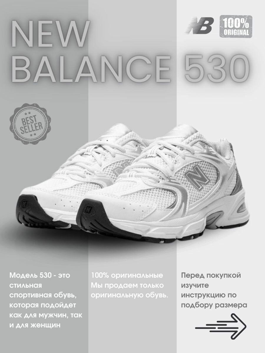 Кроссовки New Balance "530" - белые с серебряными вставками 44.5 eu