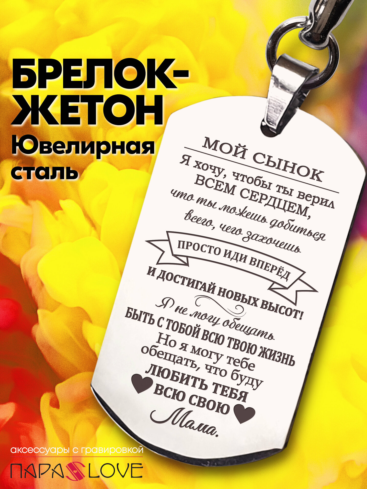 Купить Брелок для ключей мужской с надписью "Мои сынок" в упаковке с лазерной гравировкой. Жетон на сумку, рюкзак, на ключи от авто и дома.