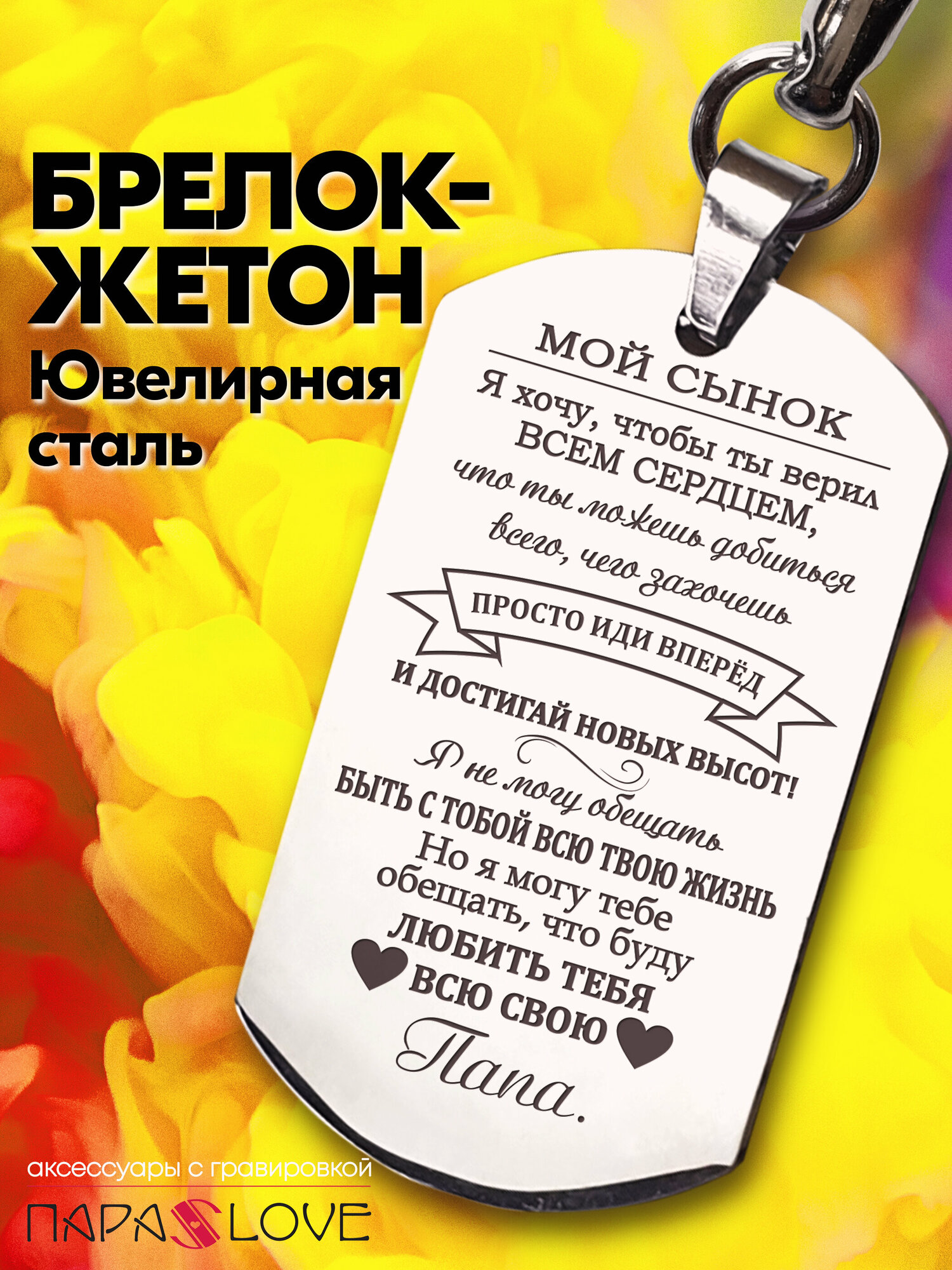 Брелок для ключей мужской с надписью "Мой сынок" от папы в упаковке с лазерной гравировкой. Жетон на сумку, рюкзак, на ключи от авто и дома. интересное: