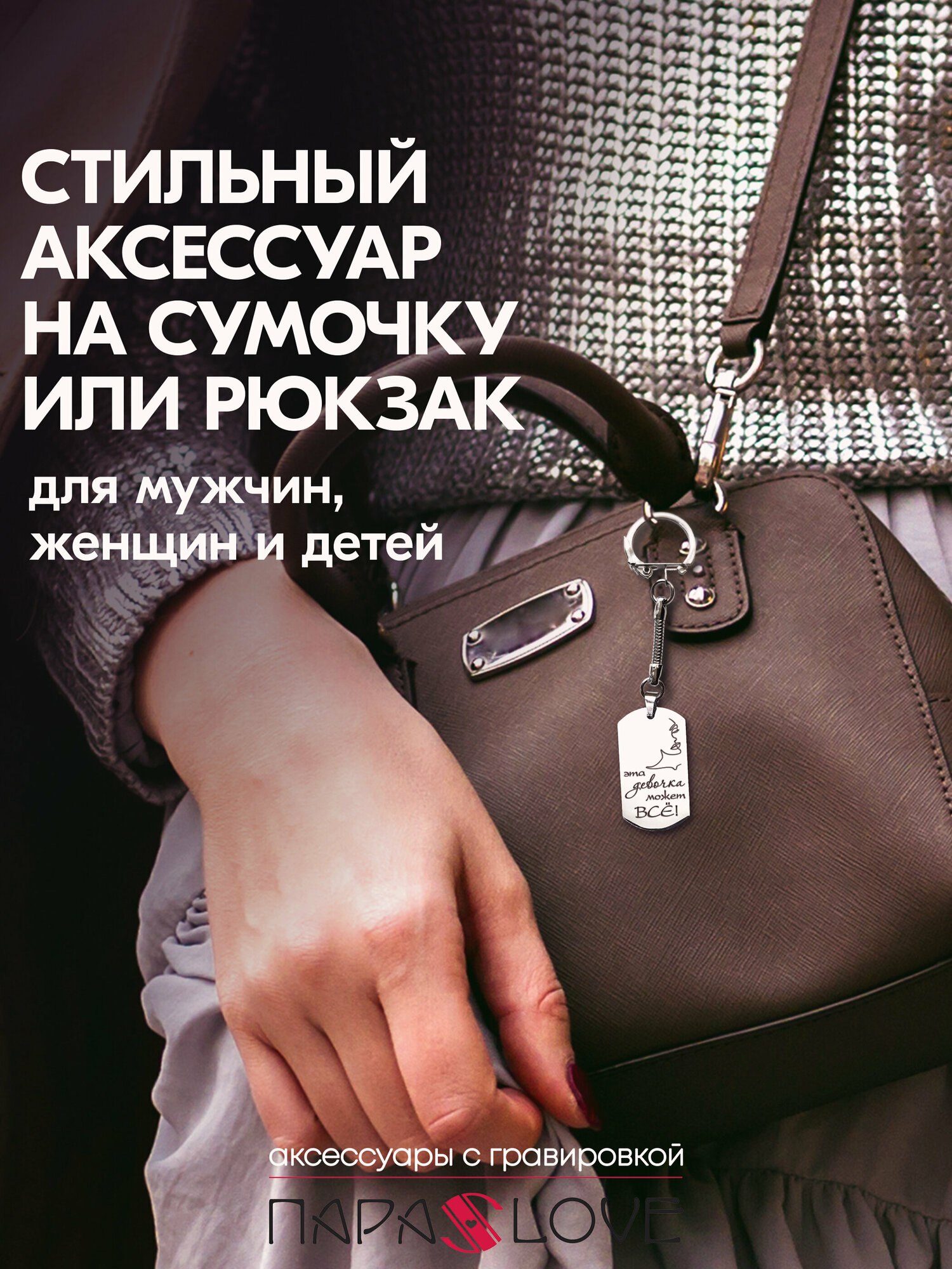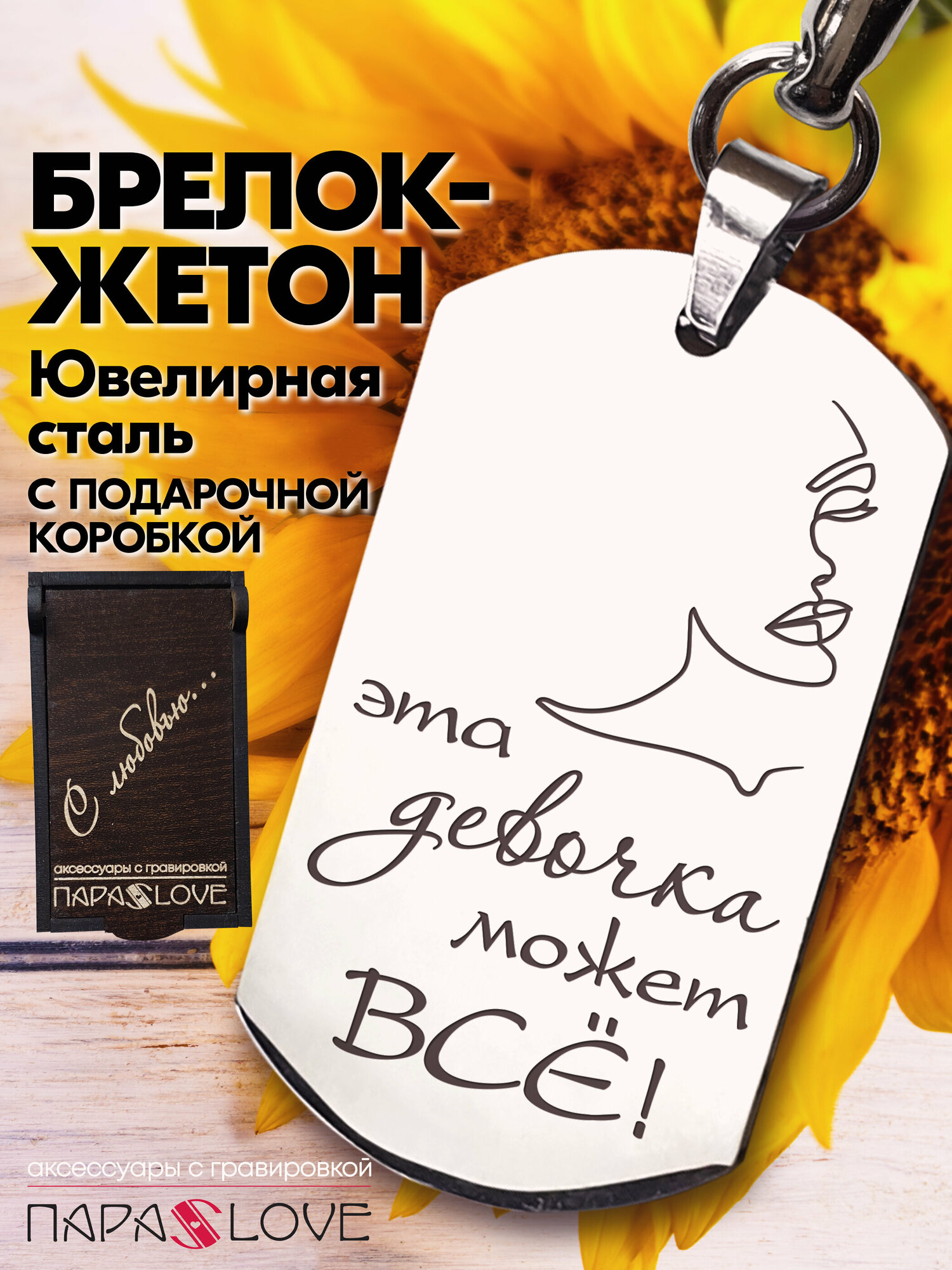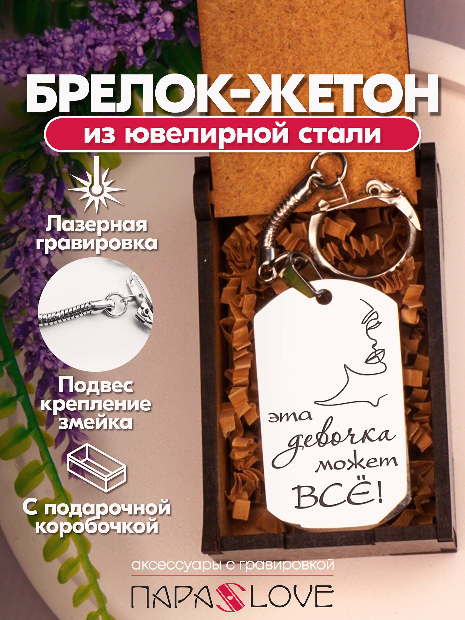 Брелок для ключей "Эта девушка может ВСЁ!" с лазерной гравировкой в подарочной коробке. Жетон на сумку, рюкзак, ключи авто и дома интересное: