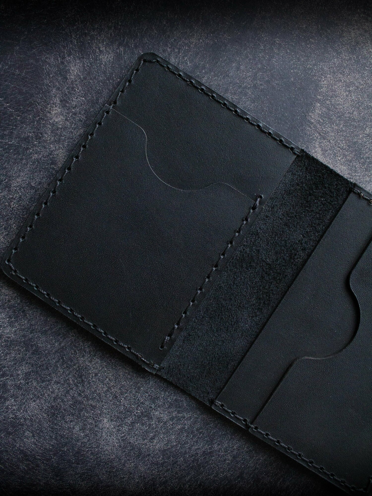 Картхолдер-книжка визитница для карт, прав, наличных KOVACH из натуральной кожи черного цвета ручной работы интересное: