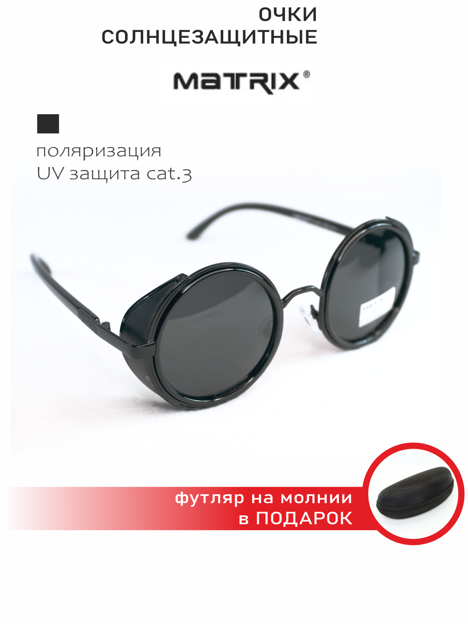 Очки солнцезащитные MATRIX (МТ8359 С9-91) круглые с боковой защитой, тишейды, стимпанк, оправа черный глянцевый металл, дужки пластик черный глянцевый, линзы черные, поляризация, боковая защита с отделкой иск. кожей +мягкий чехол+жесткий футляр в подарок