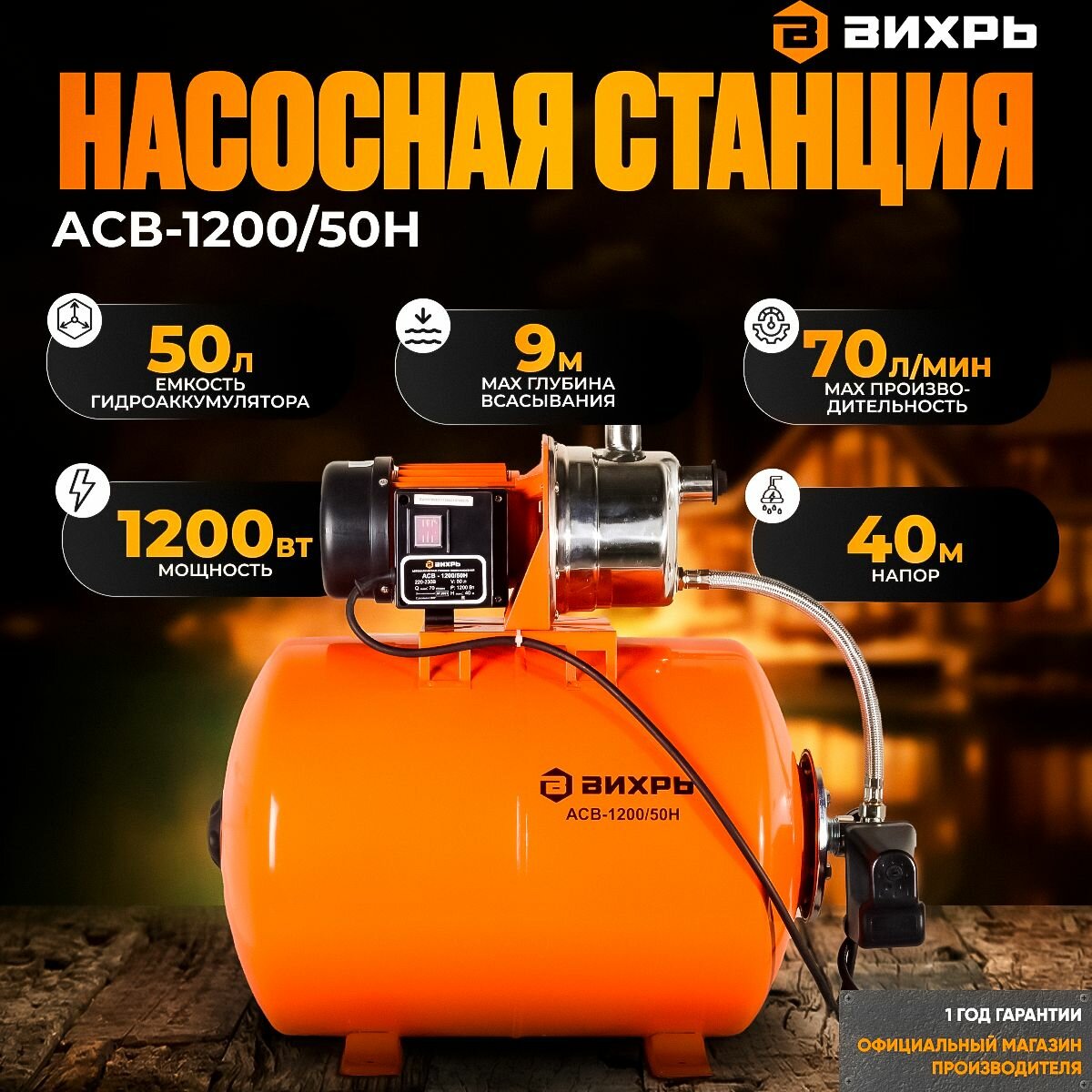 Автономная станция водоснабжения Вихрь АСВ-1200/50Н, 1200 Вт, напор – 40 м, 70 л/мин, гидроаккумулятор – 50 л