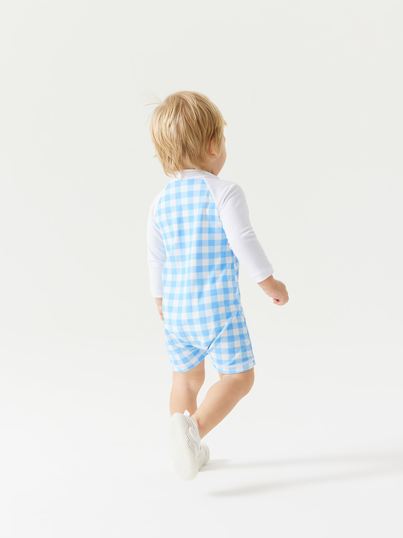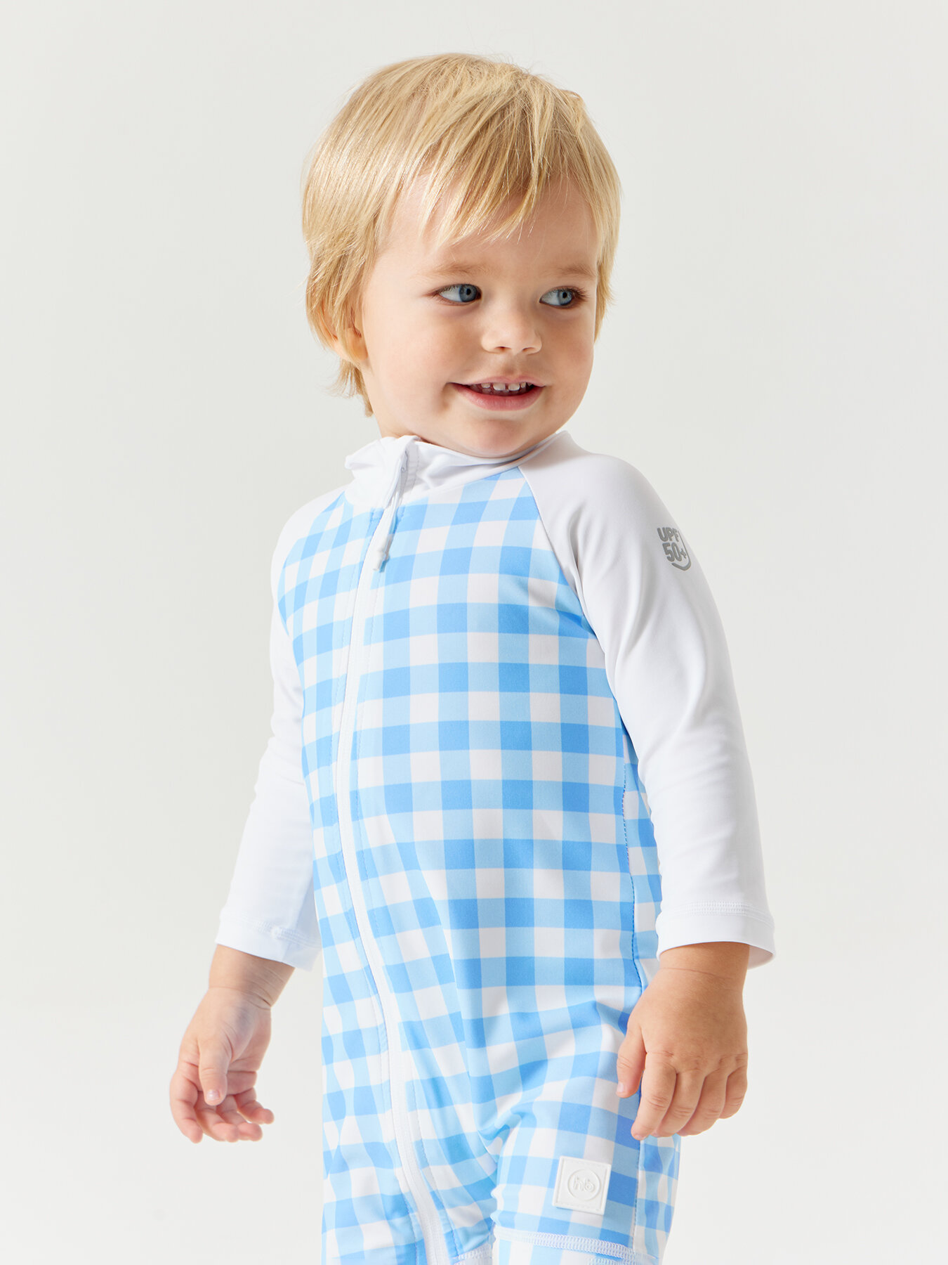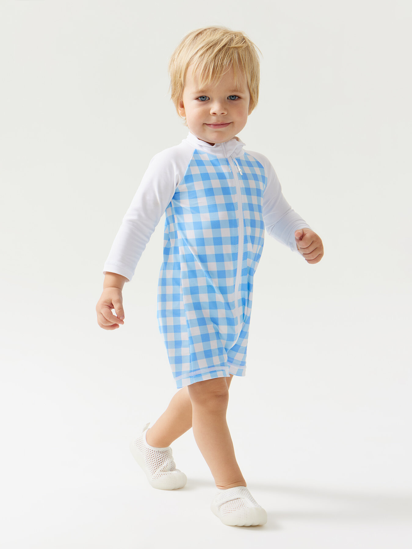 50654, Купальник слитный детский для девочки Happy Baby, купальный костюм закрытый, для пляжа и для бассейна, голубой в клетку , размер 68-74 интересное: