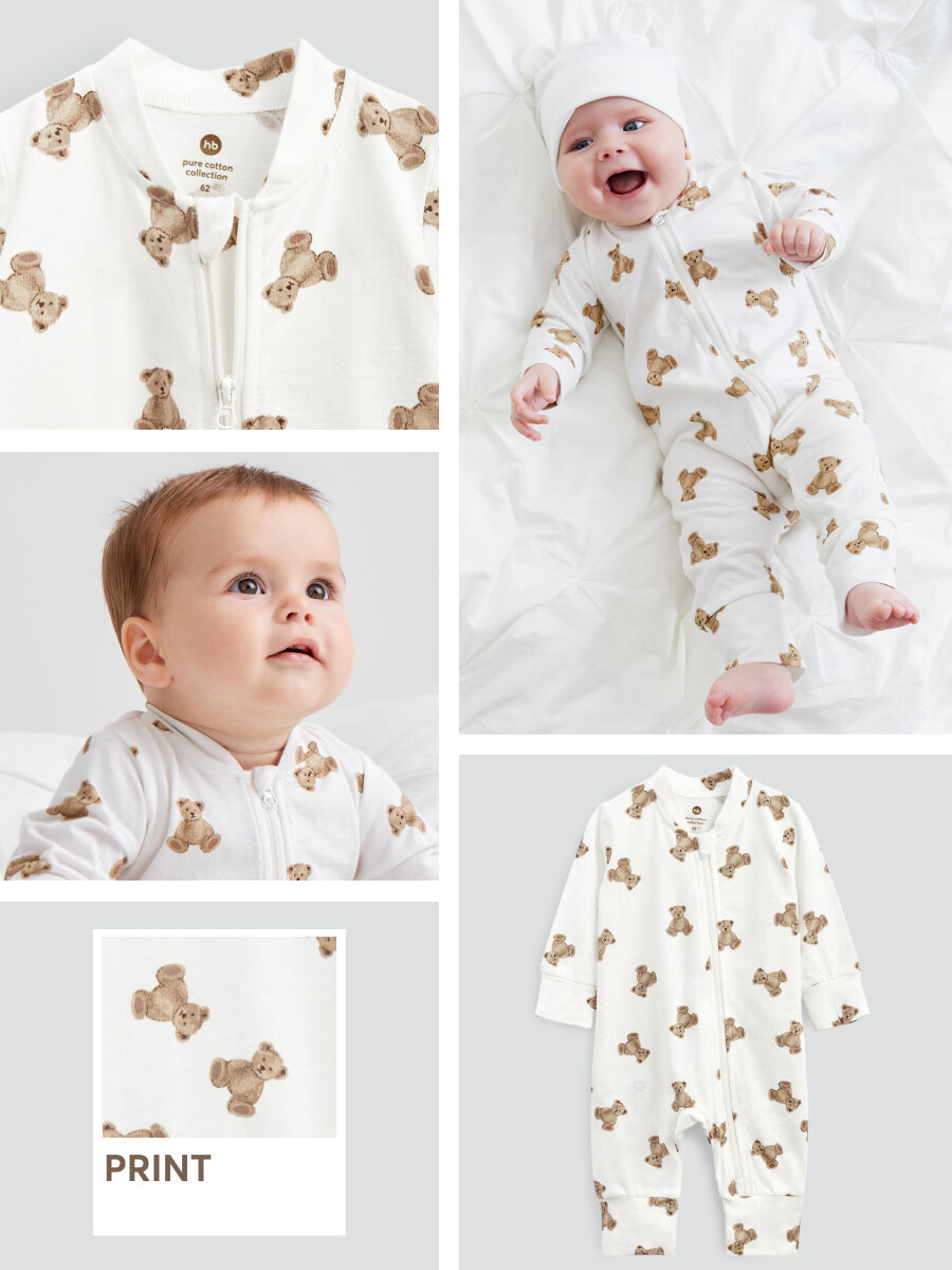 Сохранить90114, Комбинезон для новорожденных Happy Baby детский для мальчика и для девочки на молнии, под подгузник, хлопоковый, белый, с мишками, 74 интересное: