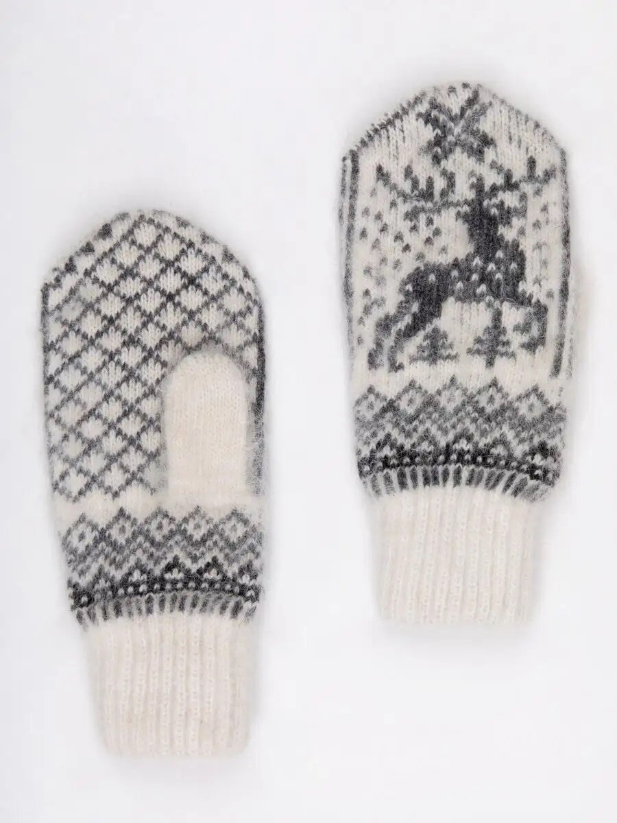 Шерстяные варежки женские, 100 % козья шерсть, скандинавский орнамент с Северным оленем, серый-белый цвет 6-8 размер
