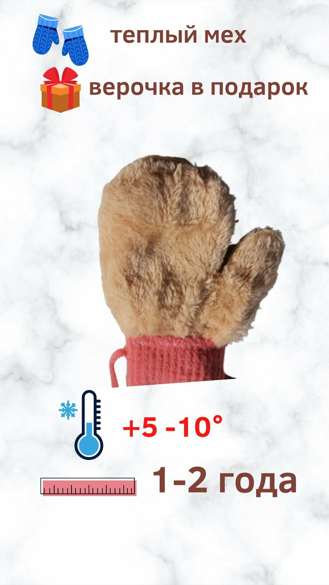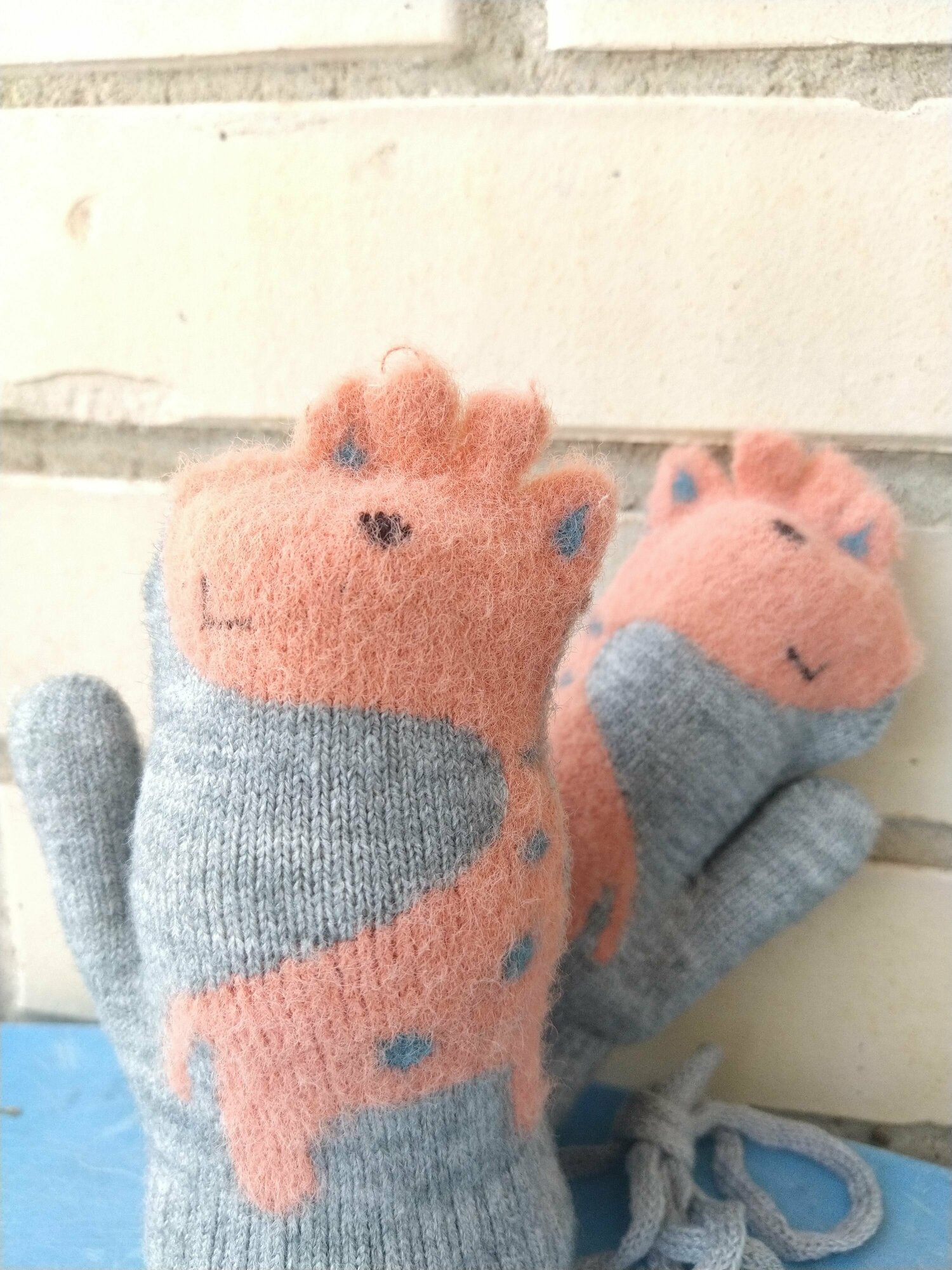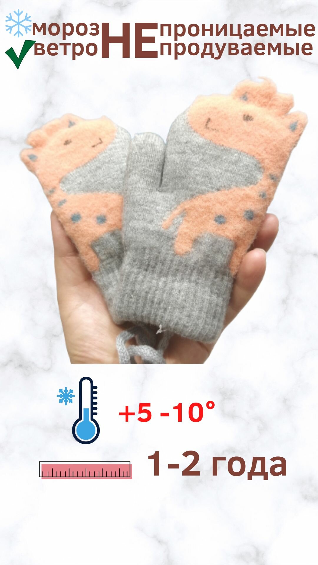 Детские варежки с жирафом / Зимние варежки на веревочке с милым "Жира - Фом", персиковые