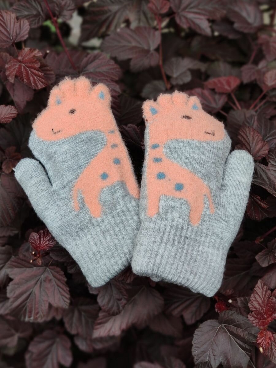 Купить Детские варежки с жирафом / Зимние варежки на веревочке с милым "Жира - Фом", серые