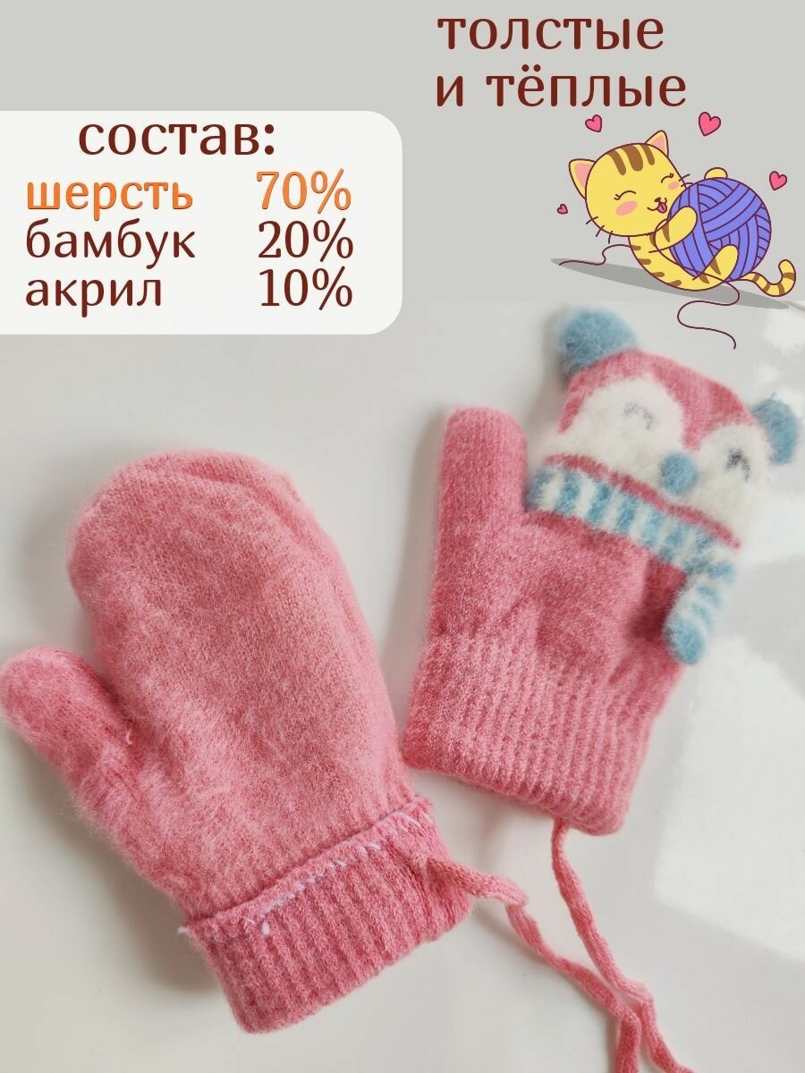 Детские варежки вязанныКотик-мария-018-розовый-1-2 с котиком / Зимние варежки на веревочке с милым "Кото - Фаном", бежевые