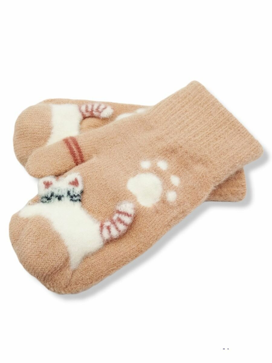 Купить Детские варежки вязанныКотик-мария-018-розовый-1-2 с котиком / Зимние варежки на веревочке с милым "Кото - Фаном", бежевые