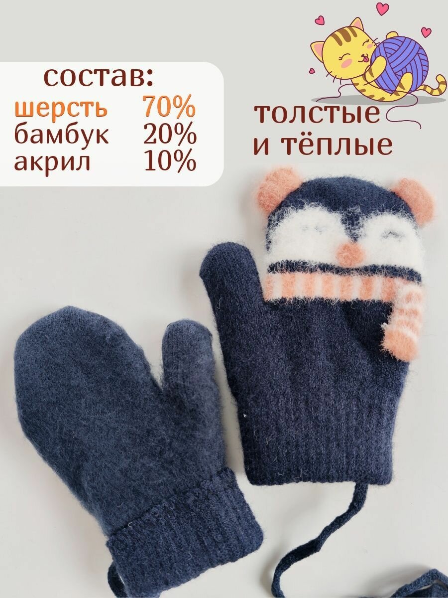 Купить Детские варежки с пингвином / Зимние варежки на веревочке с милым "Пинги - Винди", темно-синий