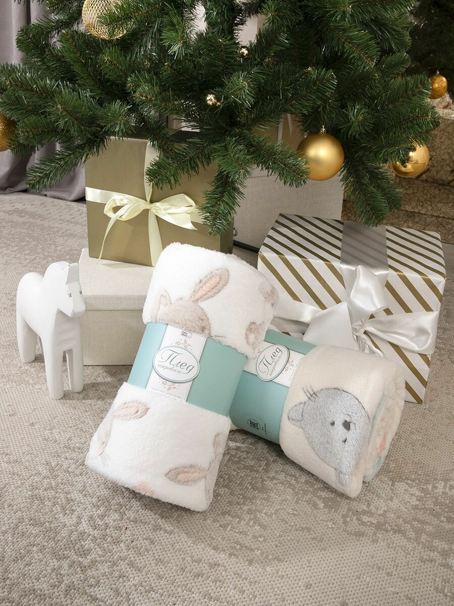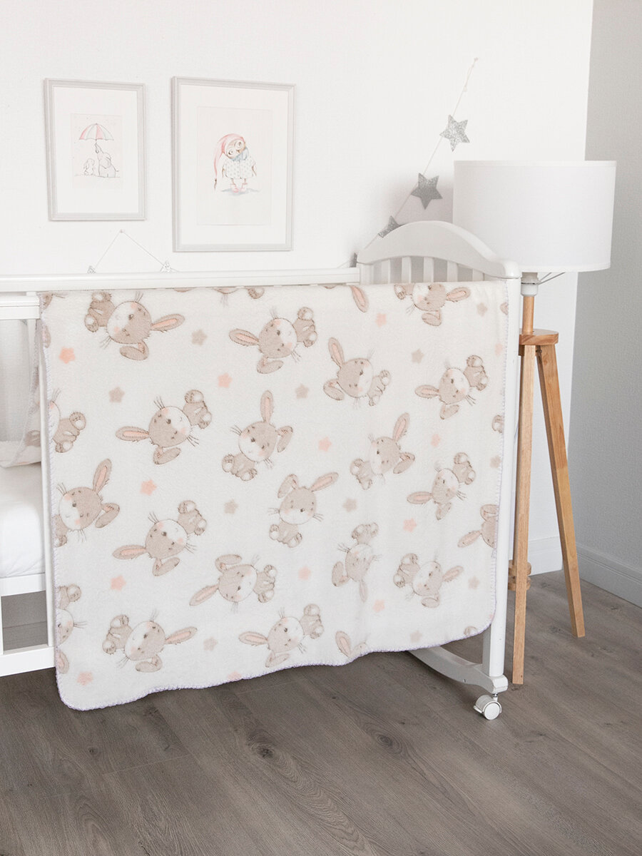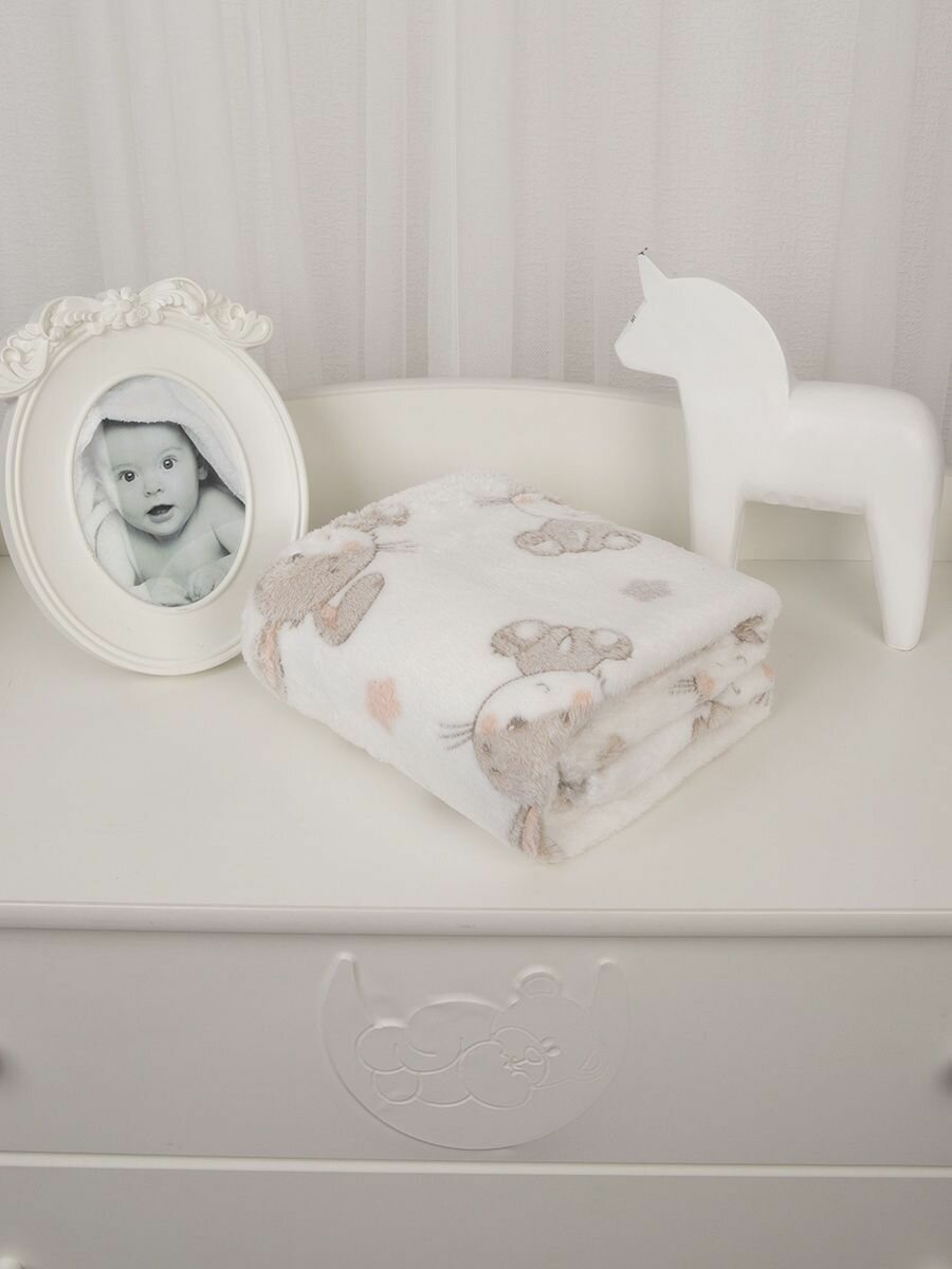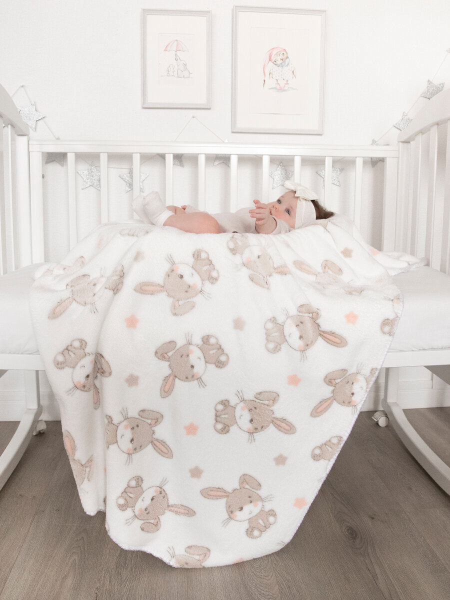 СохранитьПлед для новорожденного 75х100 пушистый детский в кроватку коляску, "Зайки на белом" интересное: