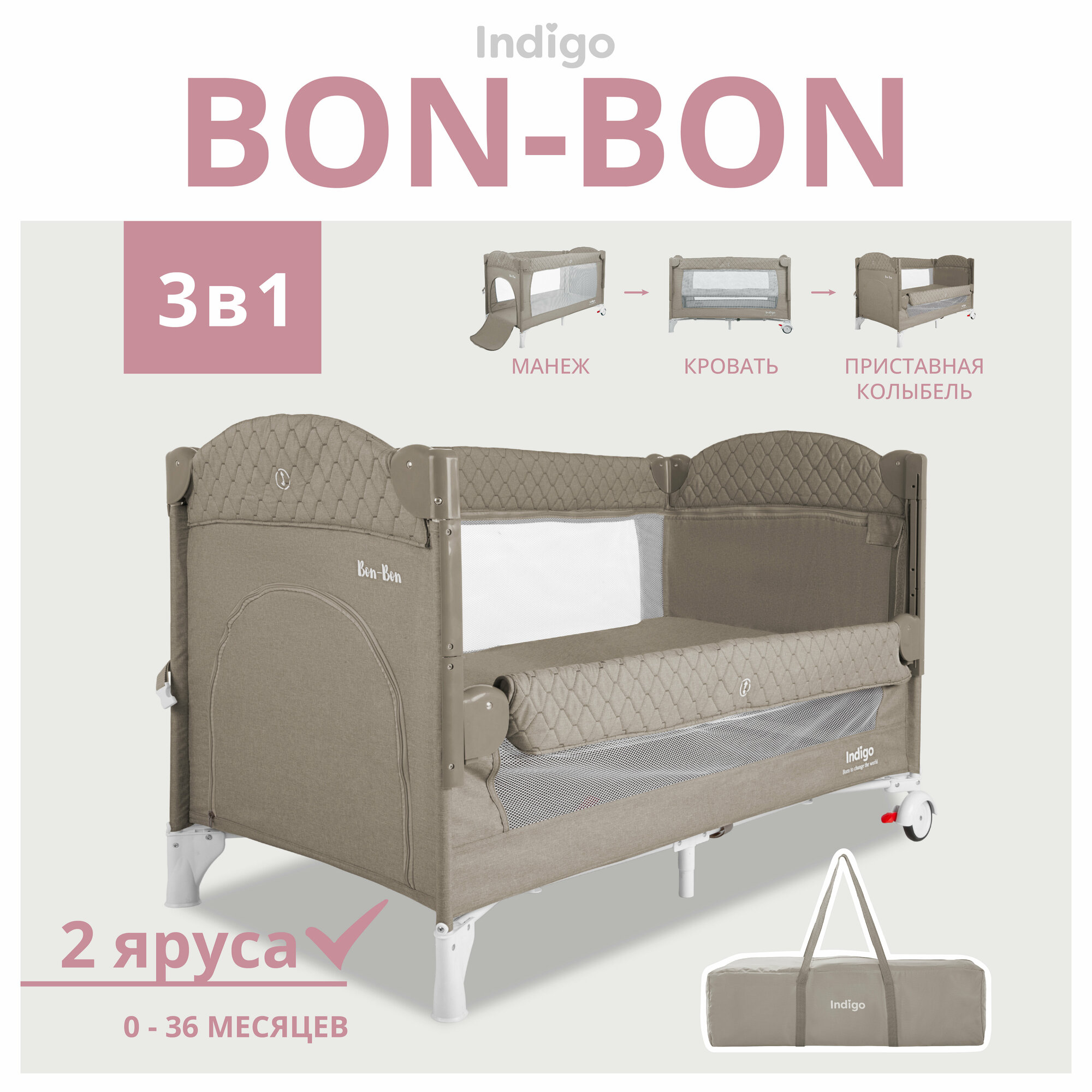 Купить Манеж-кровать 3 в 1 Indigo Bon-Bon, 0-36 мес, складной, 2 уровня, бежевый