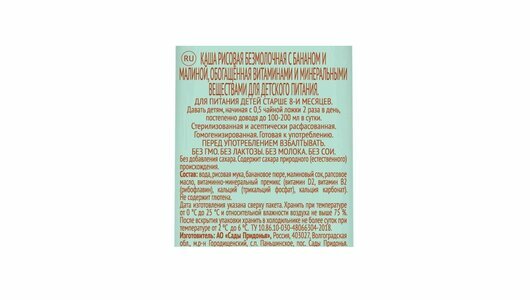 | Состав | вода / рисовая мука / банановое пюре / малиновый сок / рапсовое масло / витаминно-минеральный премикс (витамин d2 / витамин b2 (рибофлавин) / кальций (трикальций фосфат) / кальций карбонат); белки 0,7 г / жиры 2 г / углеводы 16,5 г |