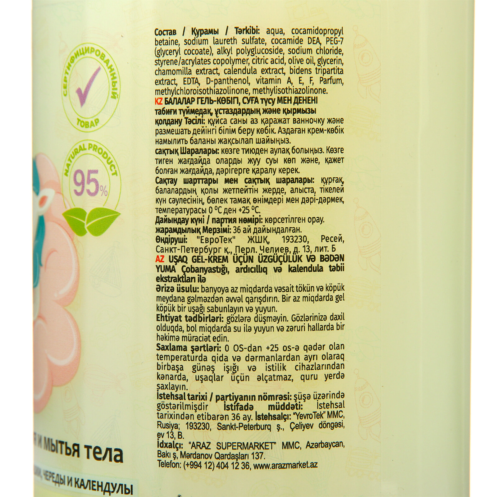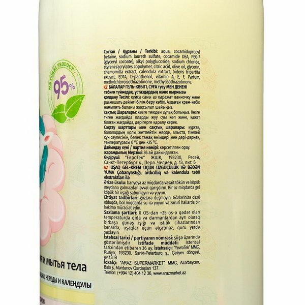 | Состав | AQUA / Cocamidopropyl Betaine / Sodium Laureth Sulfate / Cocamide DEA / PEG-7 Glyceryl Cocoate / Alkyl Polyglucoside / Sodium Chloride / Styrene/Acrylates Copolymer / Citric Acid / Olea Europaea (Olive) Oil / GLYCERIN / CHAMOMILLA RECUTITA (MATRICARIA) FLOWER EXTRACT / Calendula Officinalis (Calendula) Extract / Bidens Tripartita Flower Extract / Disodium EDTA / PANTHENOL / Liposentol / Parfum / Methylchloroisothiazolinone / methylisothiazolinone. |
