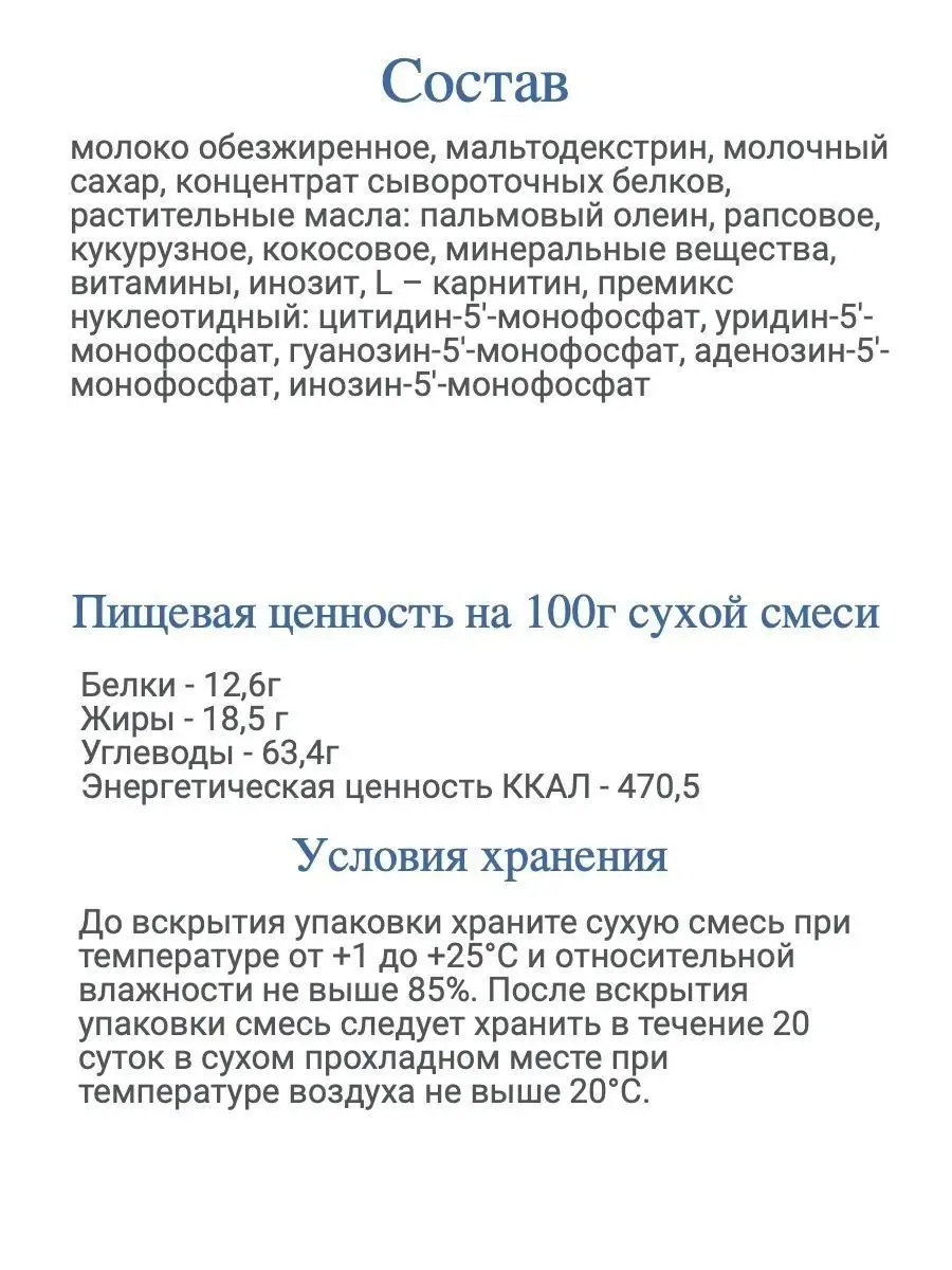 | Состав | молоко коровье обезжиренное / мальтодекстрин / растительные масла (высокоолеиновое подсолнечное / кокосовое / соевое) / лактоза / минеральные вещества / витамины / лютеин; премикс нуклеотидный: цитидин-5'-монофосфат / уридин-5'-монофосфат / гуанозин-5'-монофосфат / аденозин-5'-монофосфат / инозин-5'-монофосфат |